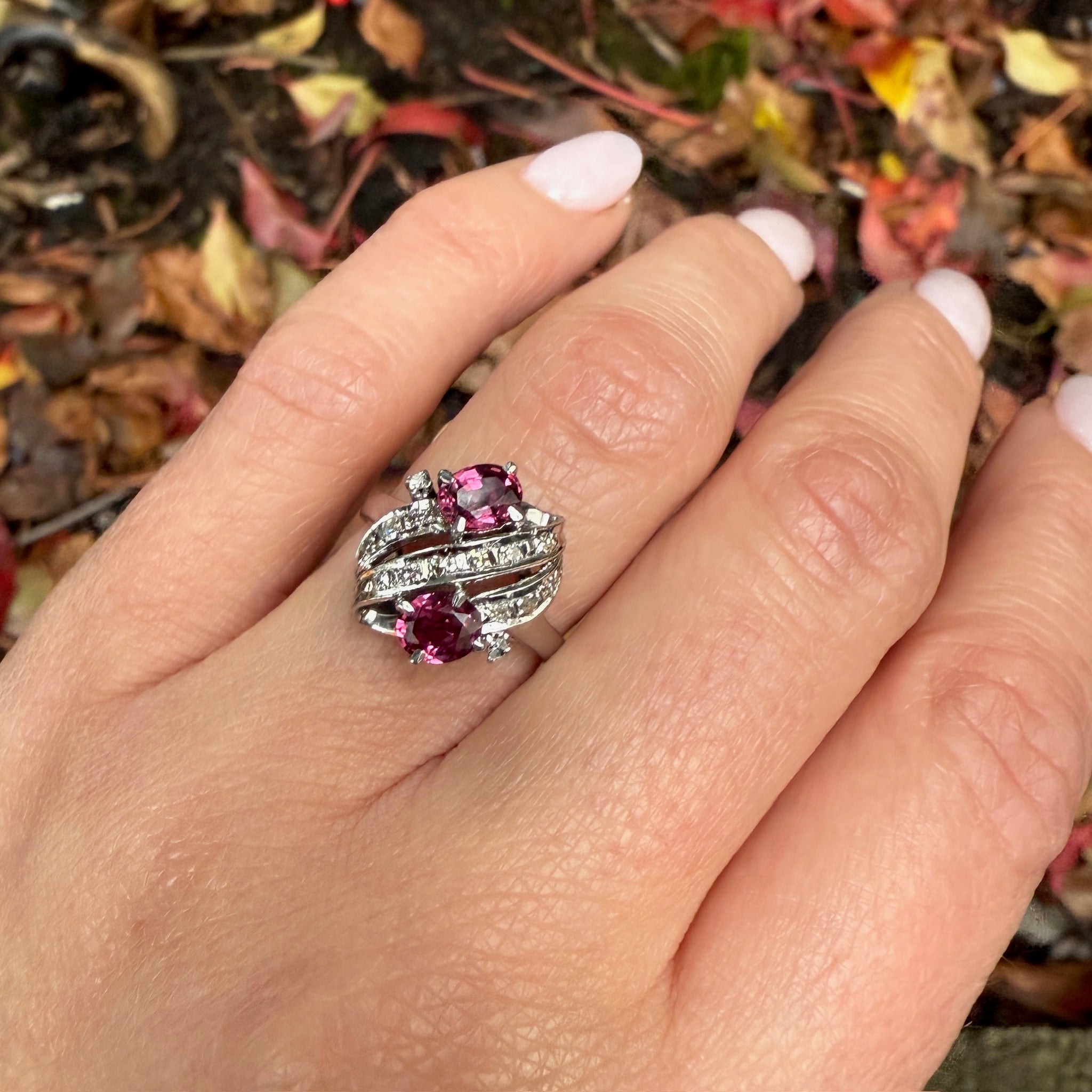 Two very pretty oval red spinels are held in a ribbon like setting with tiny twinkling diamonds. A lovely mid 20thc dress ring, .14k white gold, circa 1950.