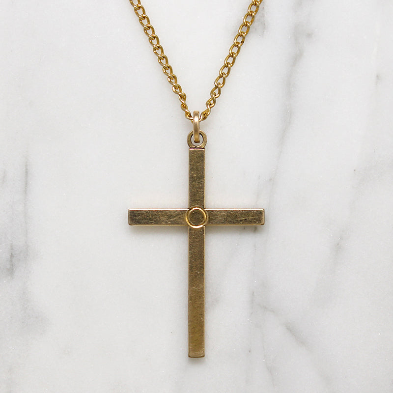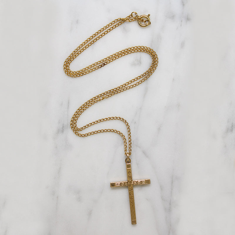 This lovely gold filled cross is engraved with a classic Art Deco motif that pairs pinstripes and flowers. The back is plain and polished, with a single circle incised at the cross' intersection. A lovely piece that glitters in the light. The cross is slightly larger than usual for the era. It hangs on a vintage gold fill curb chain. Circa 1920.