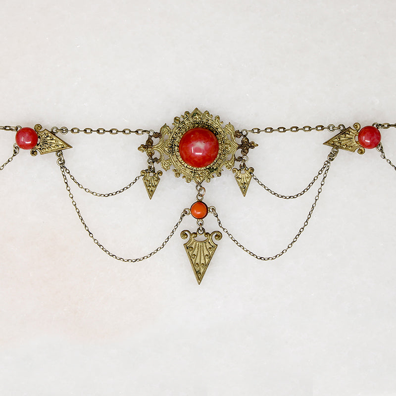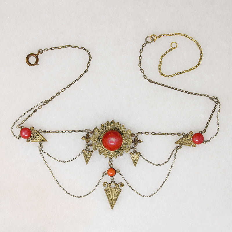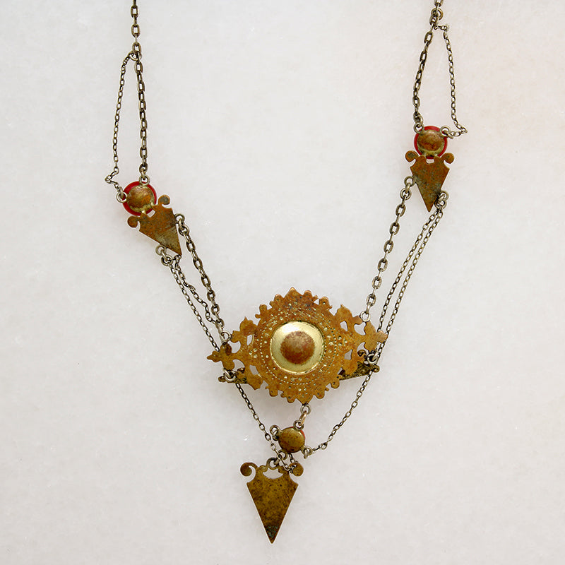 This brass and glass swag necklace recalls the European avant-garde of the fin de siècle. Bright orange art glass cabochons are set in elaborately worked brass panels; the panels are linked by draping chains. Brass arrows point to and from the dramatic central element. The necklace has a very short wearable length, a removable extender chain has been added. Wear this to a viewing of Klimt's Beethoven Frieze. Circa 1910.