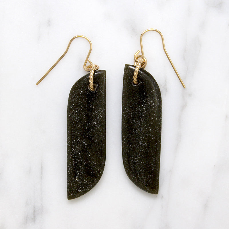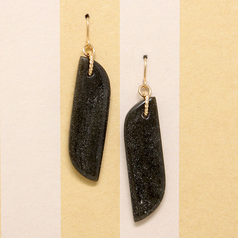 Just in time for the Holidays, Brin, an in-house artisan favorite, has launched a new collection of gorgeous earrings featuring unique stones and recycled metals. Tilde-shaped black agate drops are suspended from a pair of decorative gold fill rings. The glittering golden rings compliment the midnight black stone beautifully. The decorative element hangs on recycled gold filled French ear wires.