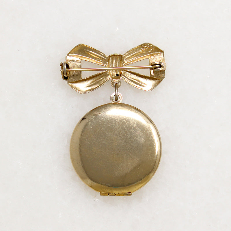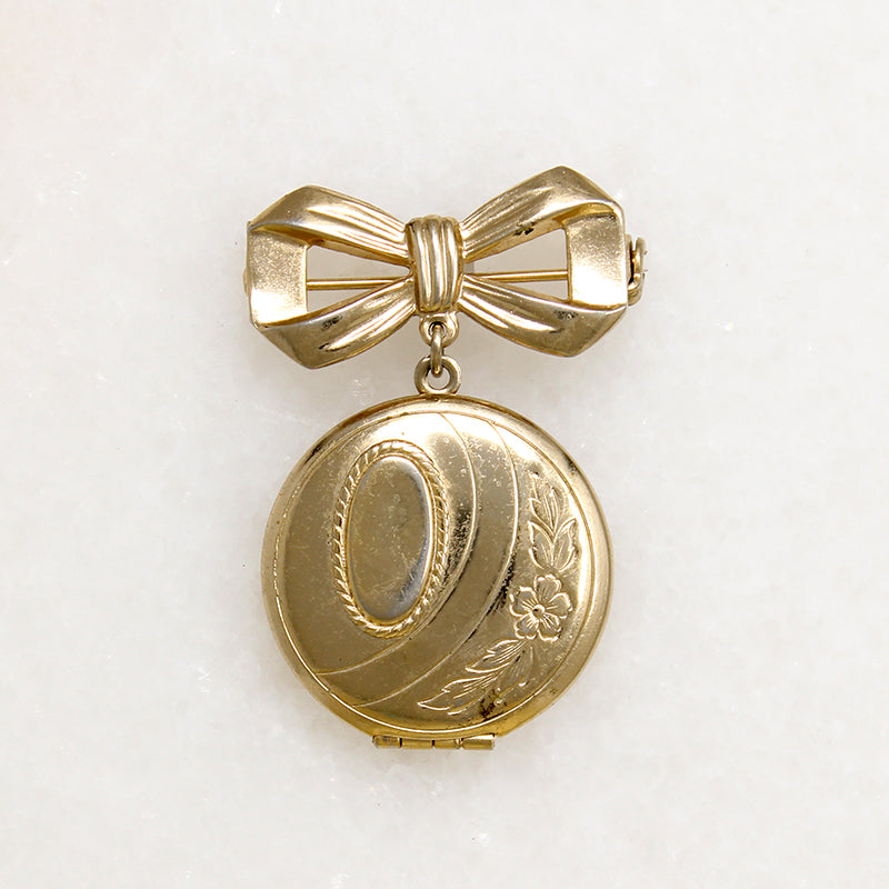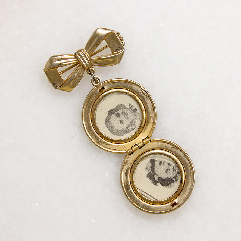 A charming gold fill locket brooch signed Coro. The round locket is engraved with a vaguely Victorian-style floral sprig. The locket is suspended from a sassy little bow pin with a rollover clasp. Inside, two frames display pictures of a pair of pretty young ladies. The brooch is marked "Coro" on the back of the bow. Circa 1940.