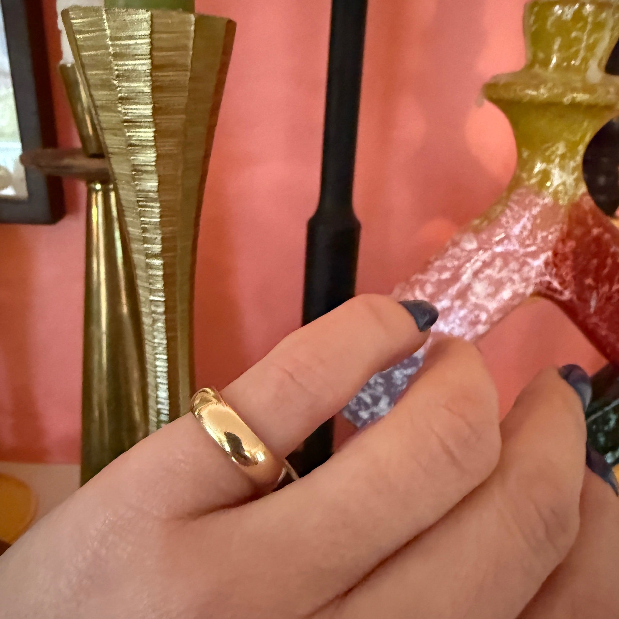 A curvaceous 14k gold wedding band in a very small size. Its deep half round exterior and comfort fit interior give the vintage ring a substantial weight. Nothing satisfies like glossy old gold.