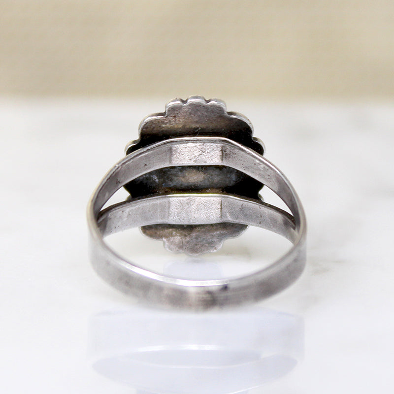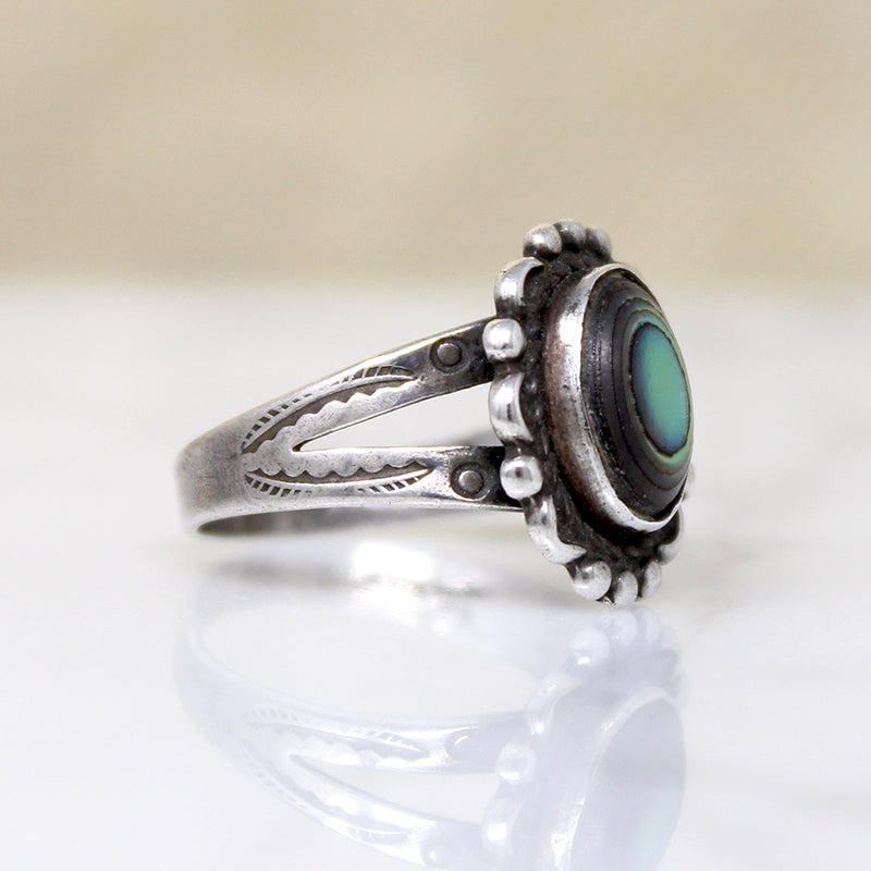 A darling sterling silver Navajo ring set with iridescent abalone. The oval abalone's pastel-colored nacre glows with a gentle magic. The abalone is set in a flowery plaque, sculpted with petals and beads. The decorative top sits above a split-shouldered band embellished with traditional rocker stamps. This pretty piece is an unsigned beauty. Circa 1960.