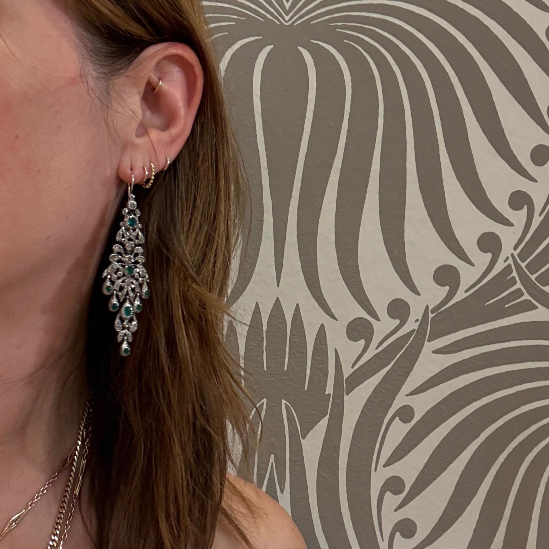 Stunning early 1800s earrings set with rose cut diamonds and cushion cut emerald pastes. These beauties are swingy and have great movement, all silver. The wires are well done gold replacements.