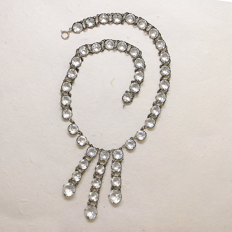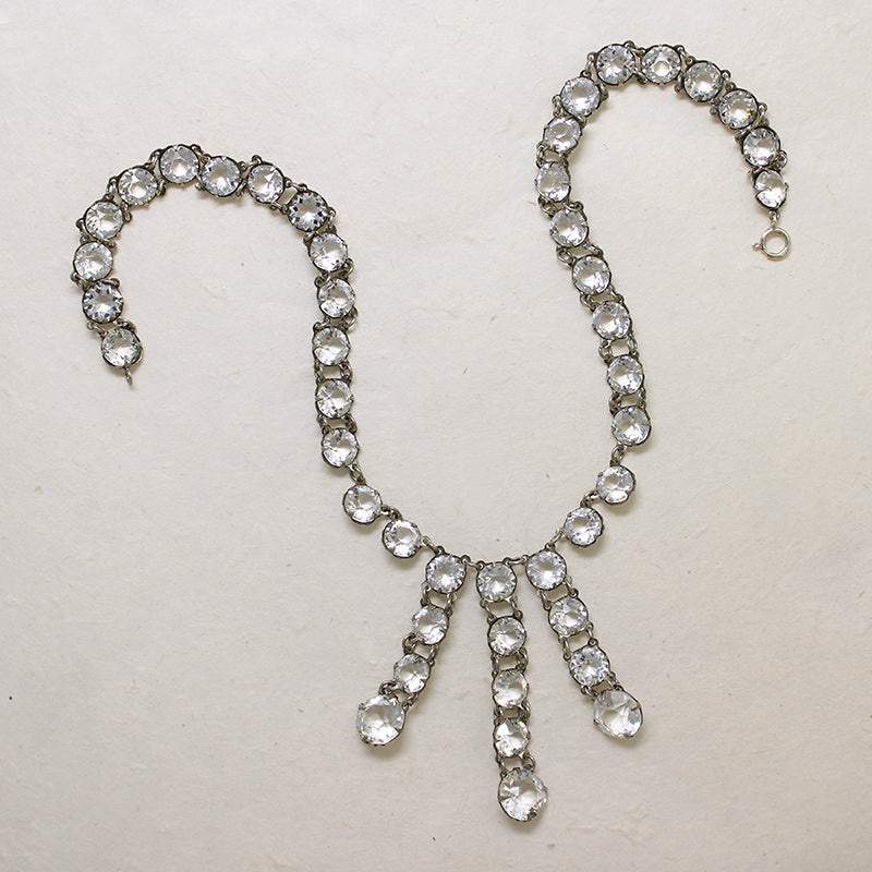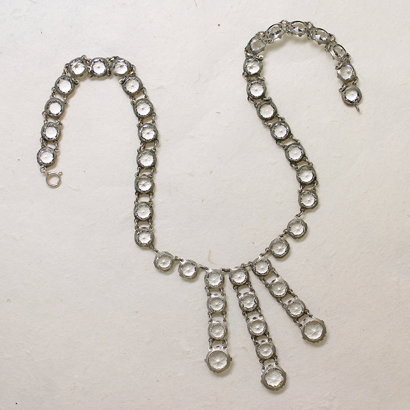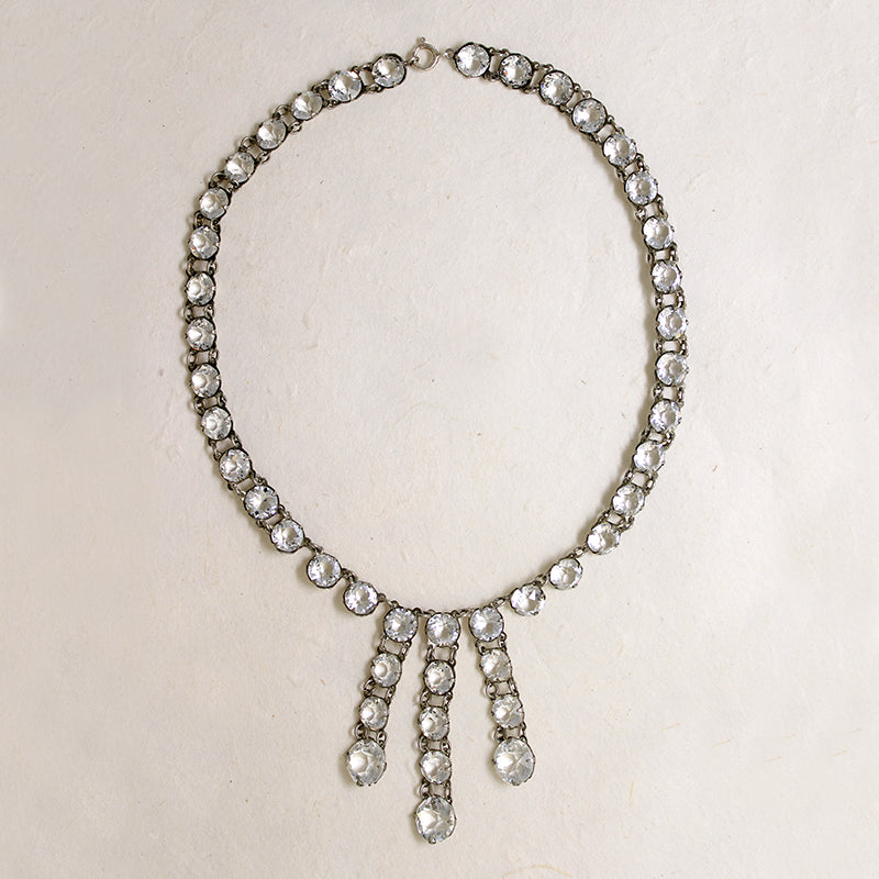 An Art Deco rock crystal fringe necklace; the style is classic and the craftsmanship is top drawer. Round, faceted rock crystals are prong-set in sterling silver and linked to form the necklace's collar. Three strands of graduated crystals drop from the front. The rock crystal is brilliantly white, elevated further by the quality of the supple silver work. This is the perfect necklace to bring some glamour to your holiday season, let's sparkle our way into 2026. Circa 1920.