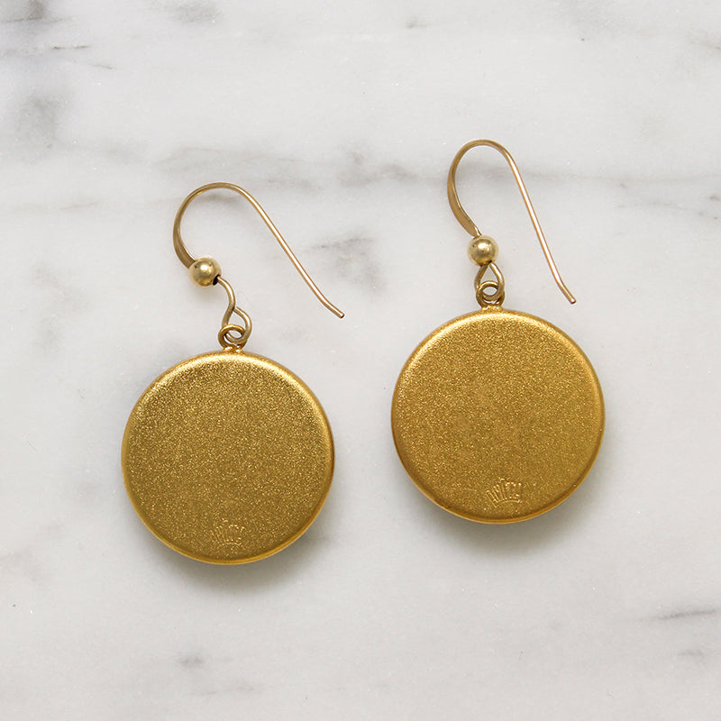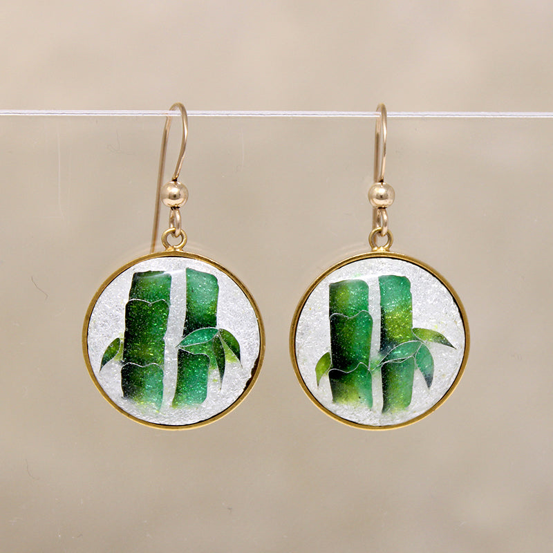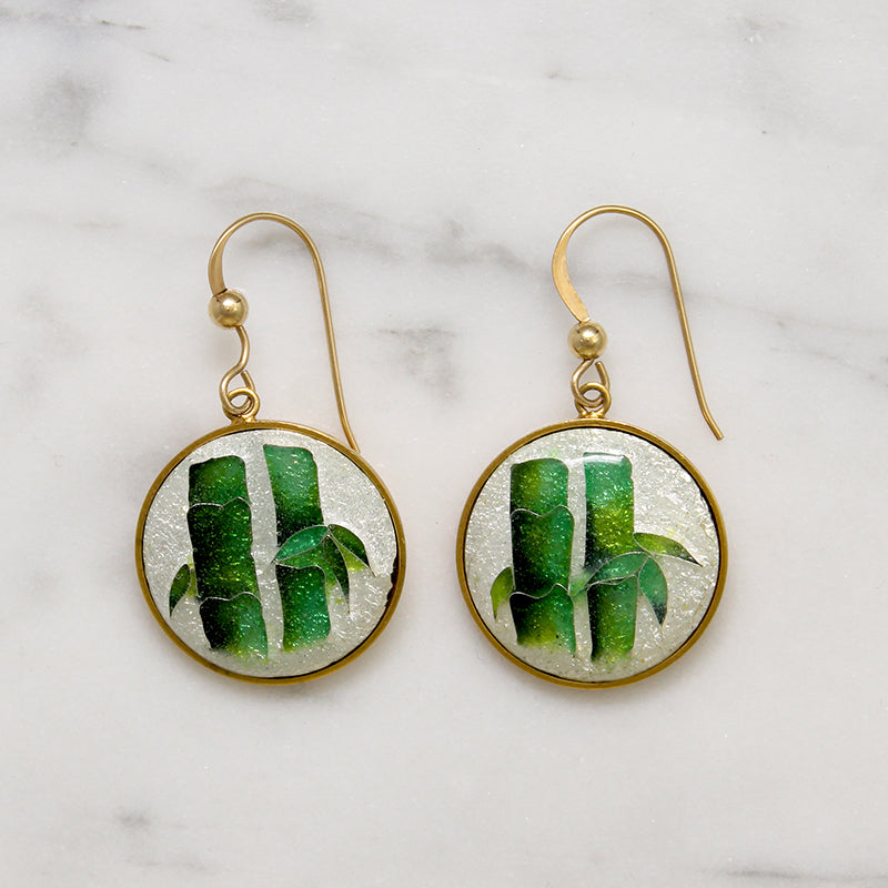 Fun and flirty earrings enamelled with bright green bamboo stalks. The bamboo appears on a discs of white enamel, set in gold filled metal bezels. The discs hang on gold fill French ear wires. Circa 1980.