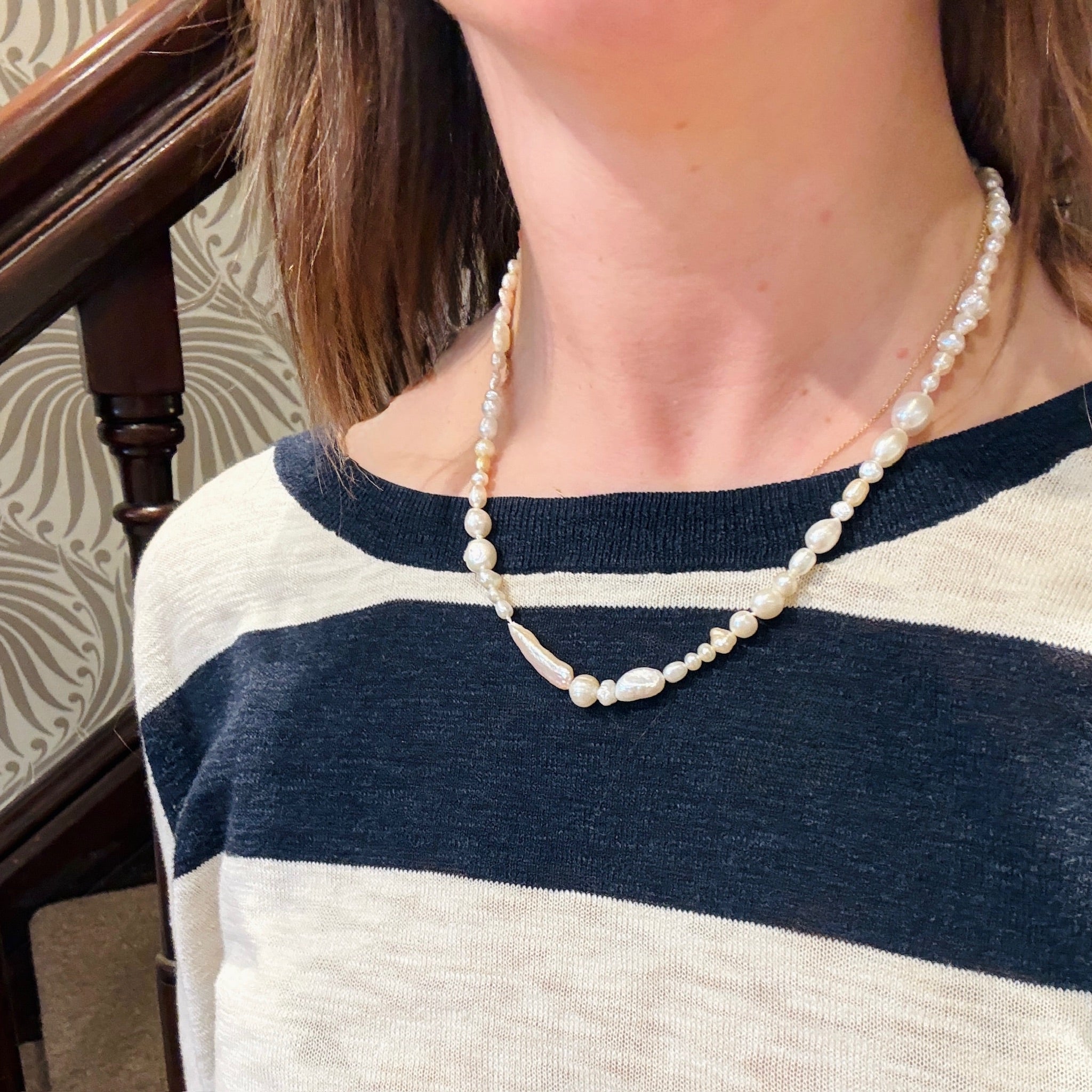 An inspired new take on the classic strand of pearls. Cultured and freshwater pearls in a variety of sizes are hand knotted on white silk. The cultured pearls are perfect glowing orbs, the freshwater pearls have a variety of wonderful baroque shapes and a silken texture; the combination feels fresh and romantic. Finished with a sterling silver spring ring clasp. Perfect for any occasion, worn alone or layered with your favorite necklaces.