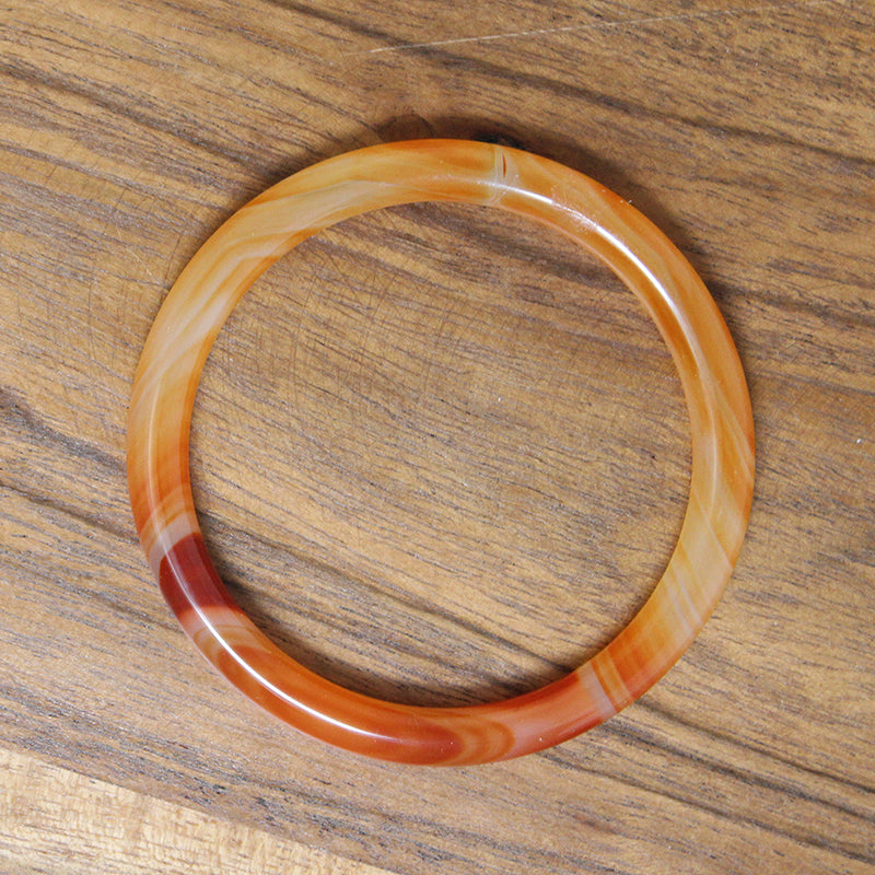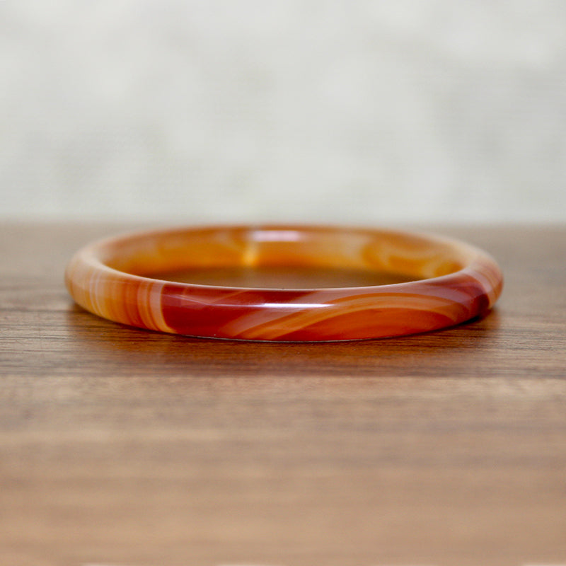 A vintage bangle bracelet of gorgeous banded agate. The round bangle displays the stone's red, orange, and gold striations to lovely effect. Perfect worn alone or stacked with your favorite gold bangles. Circa 1920.