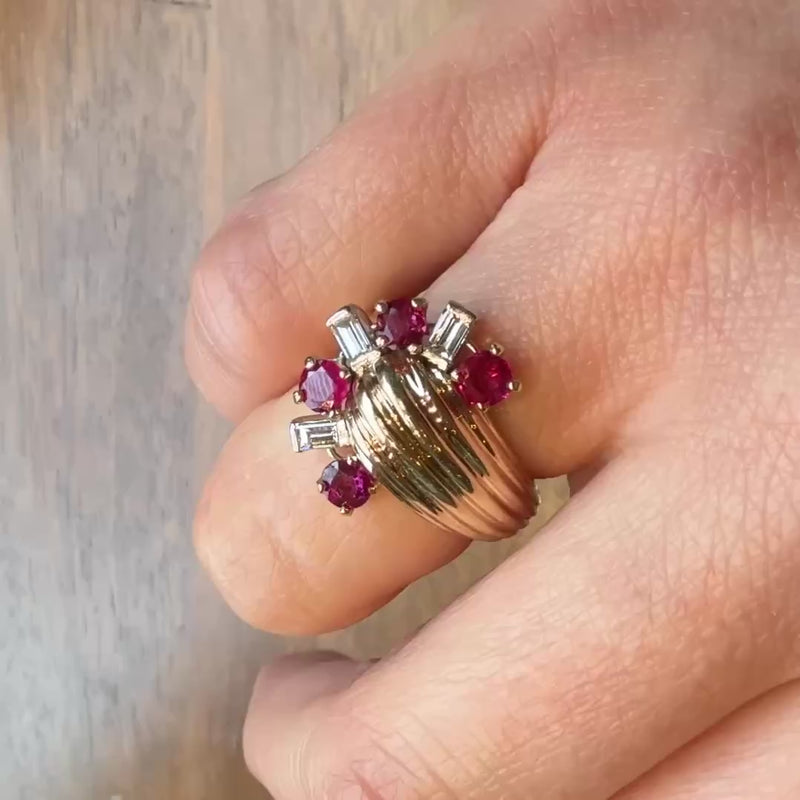 This is a truly beautiful example of Retro jewelry. This ring has the classic combination of delicious red rubies and brilliantly white diamonds set in a fan across the side. Starting under the gems a grooved gold band sweeps around to the front growing wider and ending in a voluptuous dome with the fan of gems. 14k yellow gold and Platinum. Circa 1940.