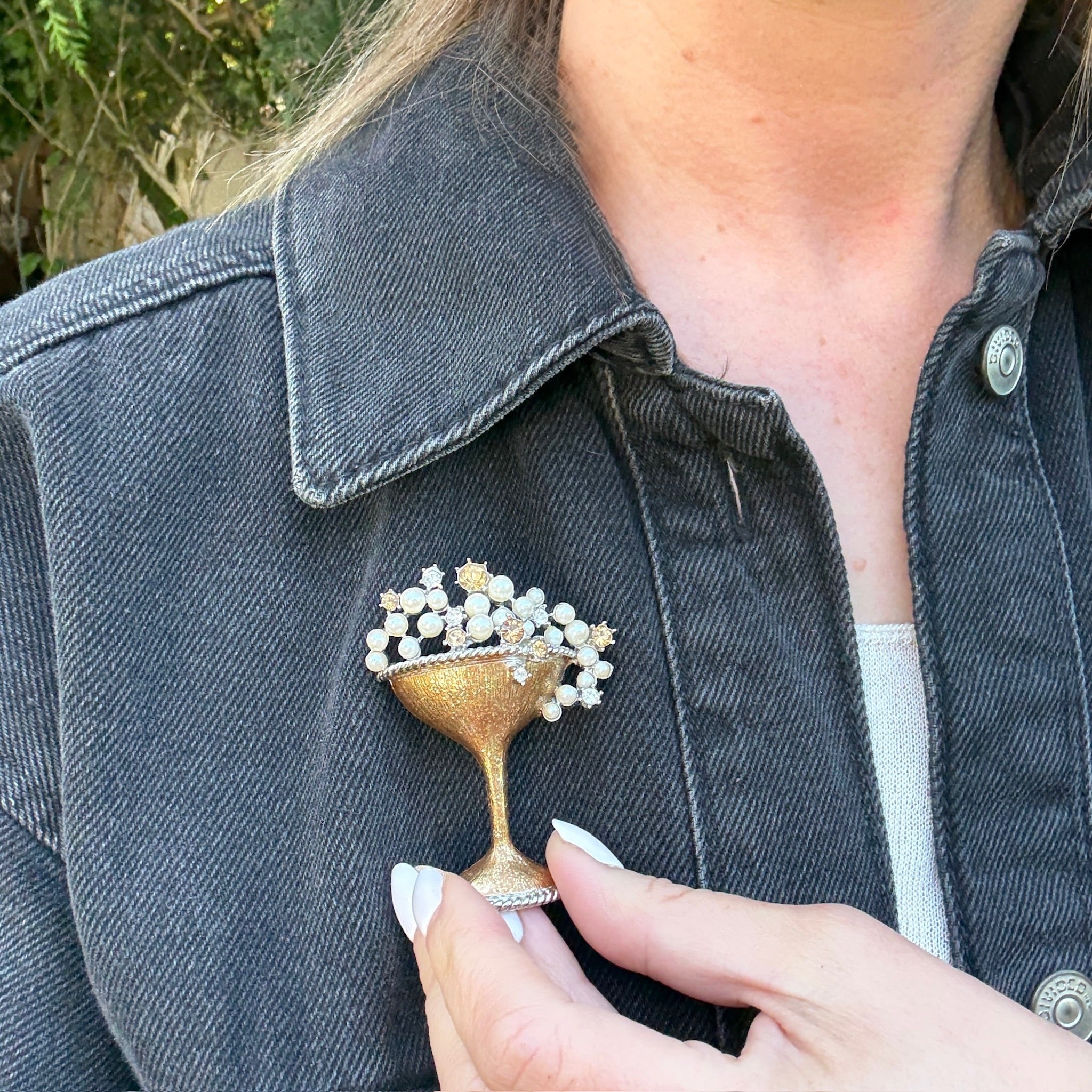A jubilant champagne glass brooch celebrating the beginning of a new millennium. A gold-enameled champagne glass overflows with effervescent faux pearls bubbles spiked with gold Austrian crystals. This dramatic piece is perfect for celebrating any special occasion. It is signed on the back, "Graziano 2000."