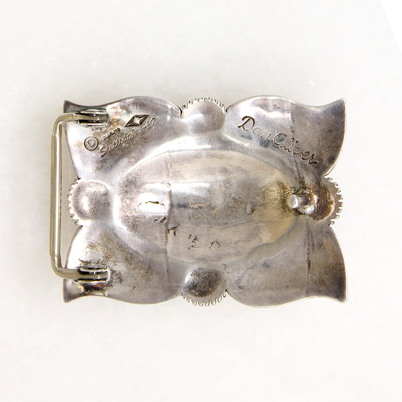 A sterling silver belt buckle signed by Dan Oliver. The rectangular buckle is a classic, with a handsome design and engraved details. Its back is marked "Dan Oliver," "Scarsdale, AZ," and "Sterling."