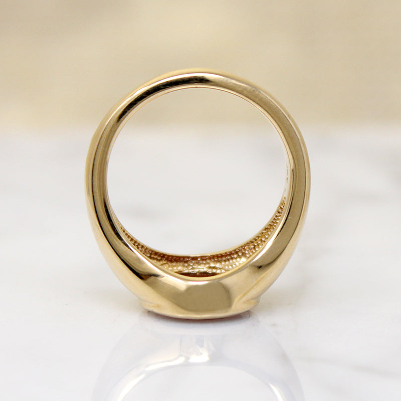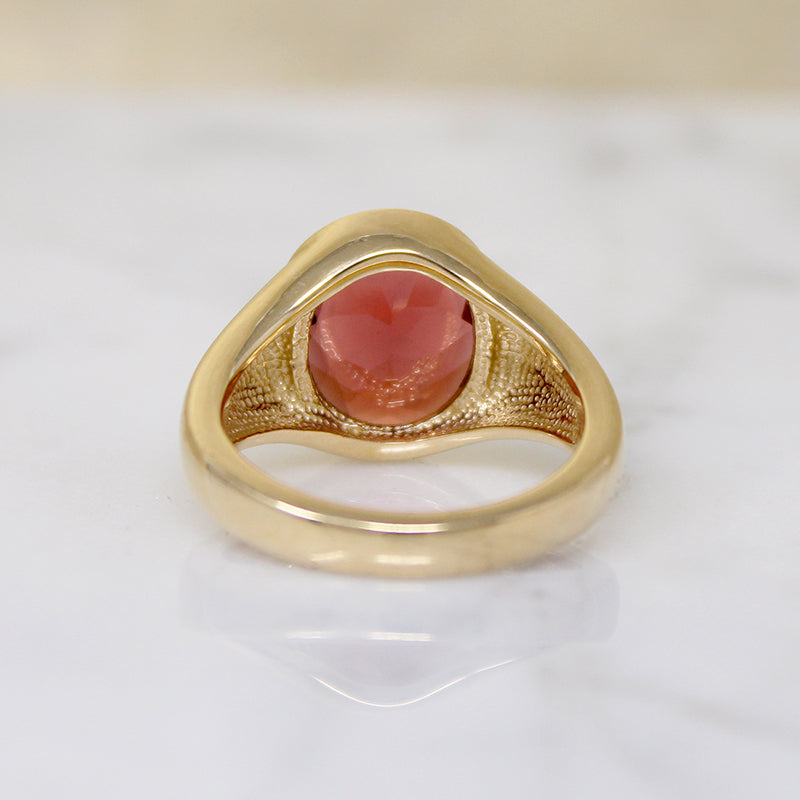 A gorgeous almandine garnet demands attention in this artisan signet-style ring. Its faceting pattern is hypnotic. The vintage garnet sits in a softly ridged bezel, inset in the gently tapered 14k gold ring. This is a classic style, perfect for highlighting a particularly attractive gemstone. Garnets are the most romantic of stones, long having been associated with passionate love.