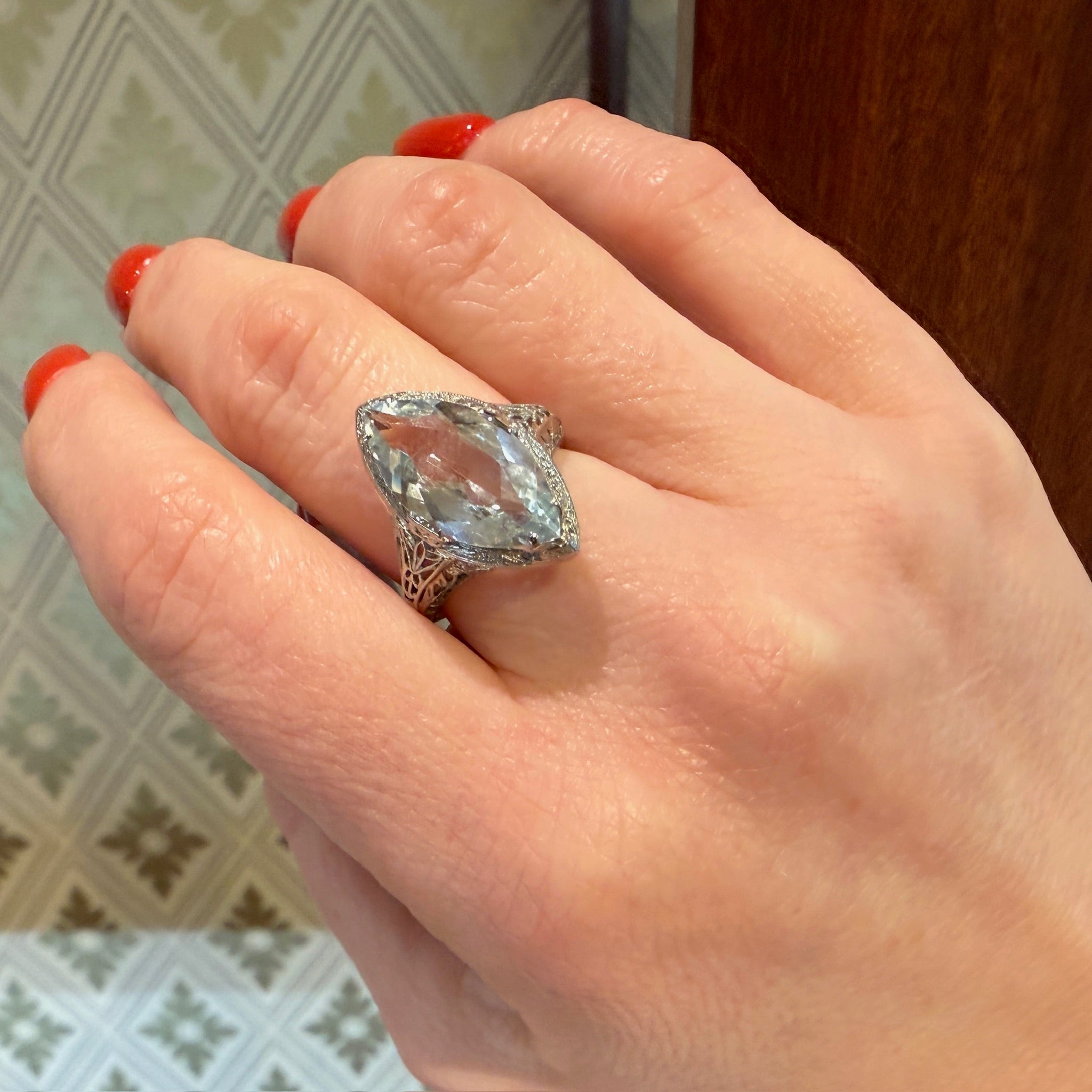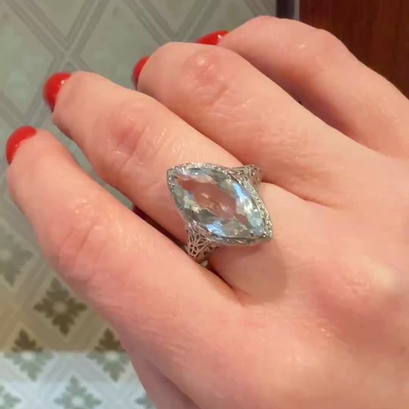 This dreamy navette ring is an Art Deco classic. An aquamarine of the most delicate ice blue color is displayed in a 14k white gold setting, covered in filigree and engraved details. The lacy shoulders and gallery are particularly exquisite, this ring is lovely from every angle. Circa 1920.