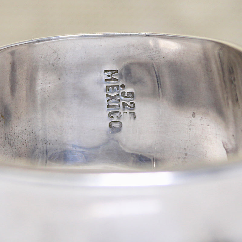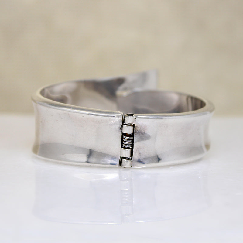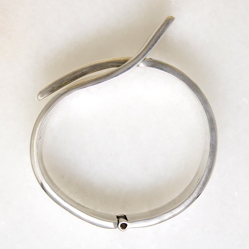 Another impressive Mexican Modernist clamper bracelet, unsigned by its talented maker. The design is simple, with a classic buckle motif. Unexpected sculptural forms make the piece great; a wide, flared frame and a long, curved prong create a dramatically Industrial aesthetic. The bracelet's back is hinged, allowing the piece to open and close easily. The interior is marked "925 Mexico." Circa 1970.