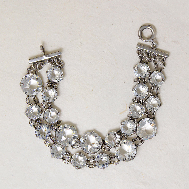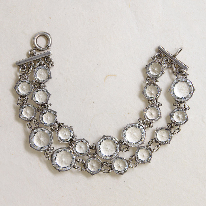 This Art Deco rock crystal bracelet will take your breath away. Two sizes of round, faceted stones are prong-set in two strands of sterling silver links. The bracelet's supple movement drives the crystals wild in the light. The piece fastens with a spring ring clasp. Absolutely irresistible, ideal for any glamorous occasion. Circa 1920.
