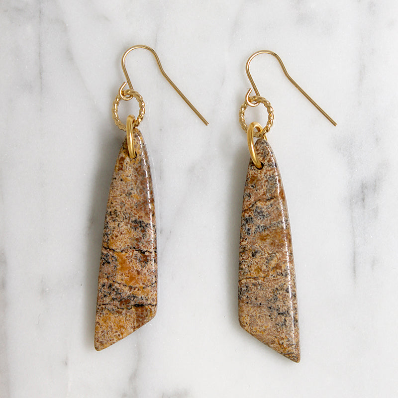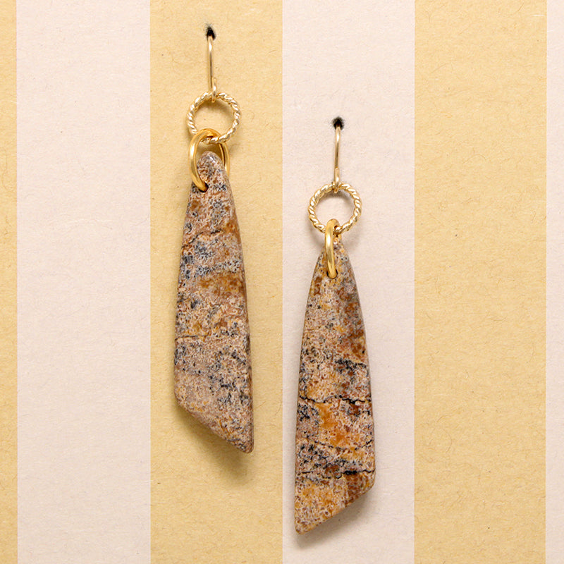 Just in time for the Holidays, Brin, an in-house artisan favorite, has launched a new collection of gorgeous earrings featuring unique stones and recycled metals. Soft scalene triangles of neutral earth-toned jasper are suspended on a pair of glittering gold filled rings. This decorative element hangs on recycled gold fill French ear wires.