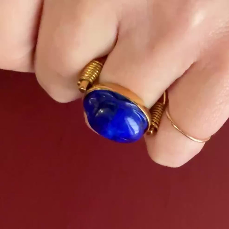 This gorgeous example of an Egyptian jewel features a hand carved Gem Quality Lapis Lazuli Scarab in a classical Egyptian swivel top ring. The back of the deep blue scarab has a group of hieroglyphs carved in it. The heavy 22k yellow gold bezel holds the scarab, pinned to a luxurious heavy 22k gold band accented by a twisted golden rope. The ring dates to the early 20thc.