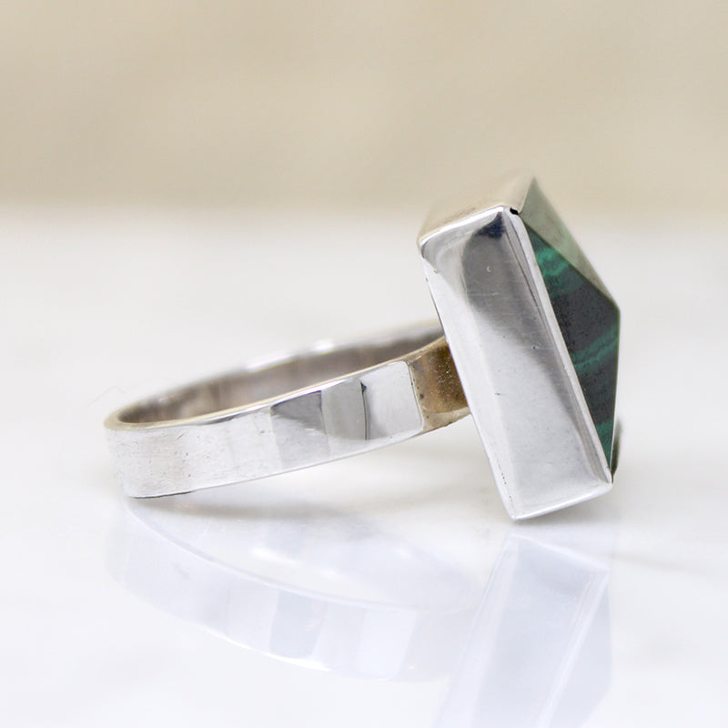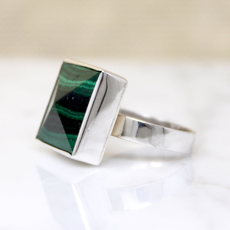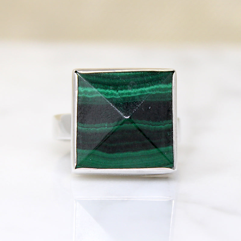 This square sterling silver ring is set with a shallow pyramid of malachite The brilliant green striations run horizontally across the face of the faceted stone. It sits in a silver box, set atop a wide, flat band. This estate ring is a captivating example of malachite's dramatic coloration.