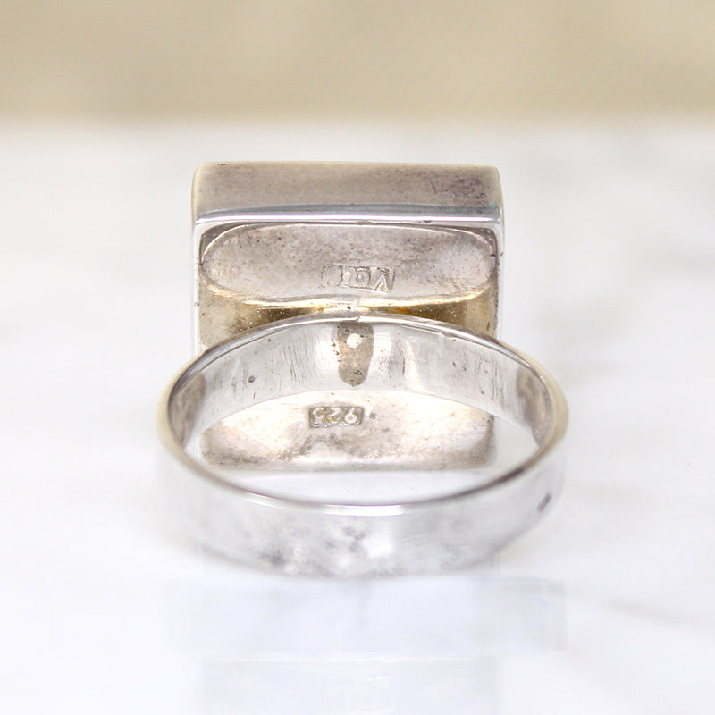 Details.....Currently a size 8. The top of the ring measures 16mm square, and the band is 3.6mm wide. In Very Good Estate Condition. You should always expect some wear on your vintage and antique jewels; we consider it a part of their charm.