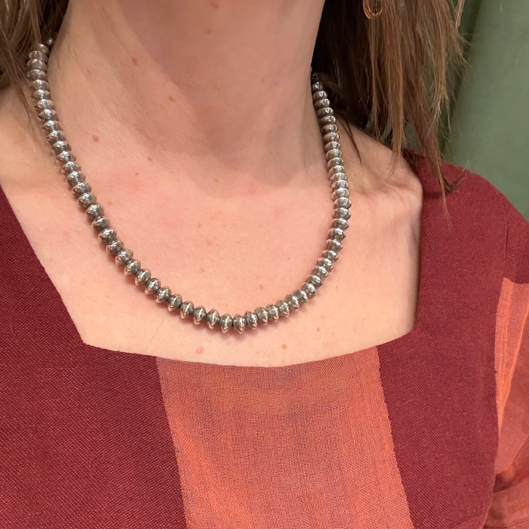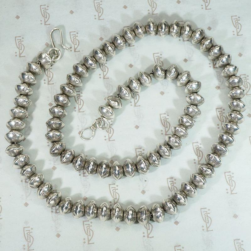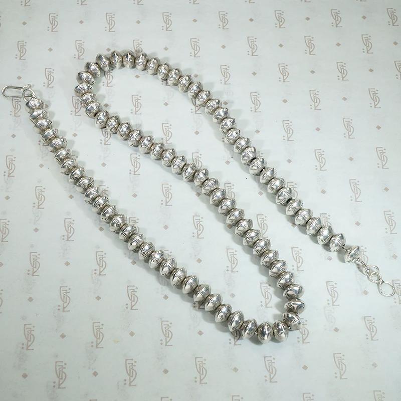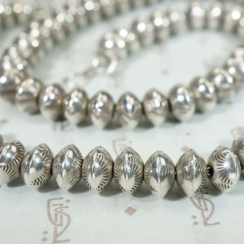 A classic Native American silver bead necklace. These are Navajo two-part construction beads strung on a silver chain. Rocker designs are stamped around the beads' edges. The necklace finishes with a silver hook-and-eye clasp. This piece has a wonderful silver patina that only time can impart. Circa 1970.