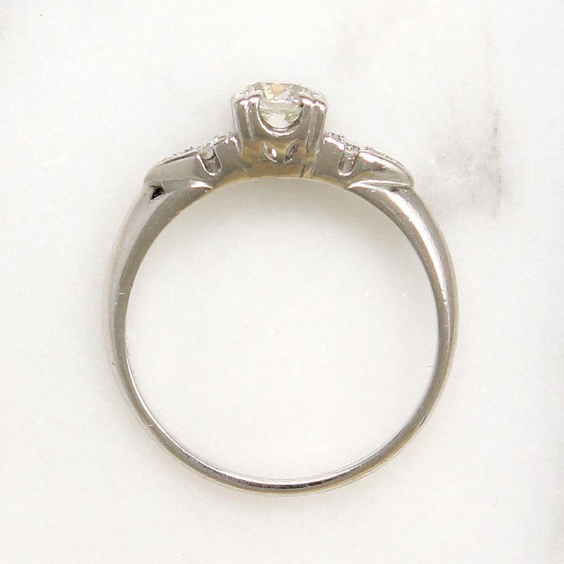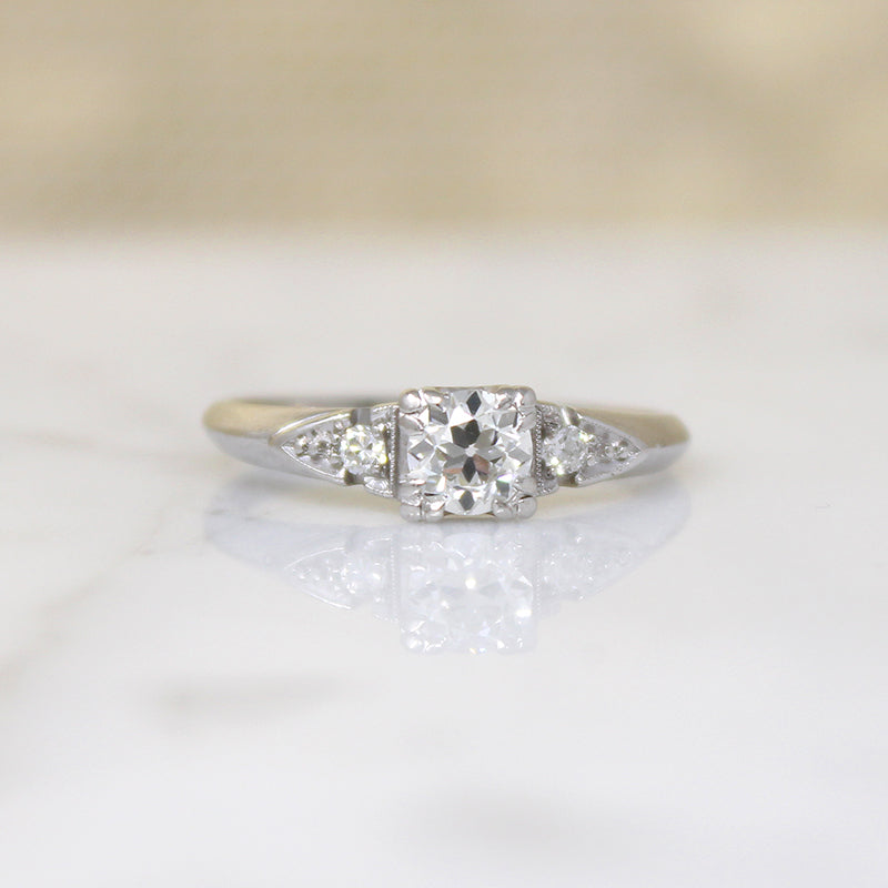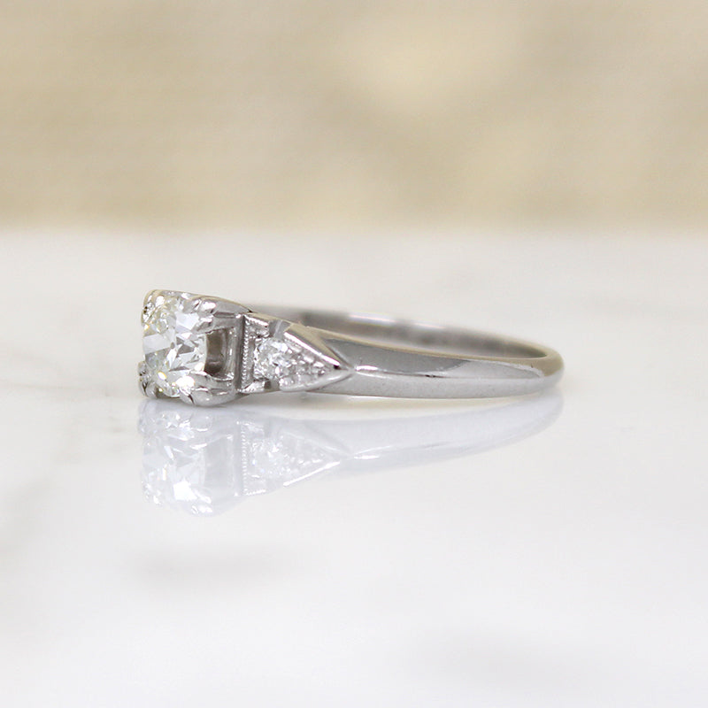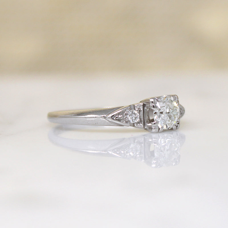 This 1940s engagement ring is a classic. A sparkling .40ct old European cut diamond is set in icy platinum, raised in a fancy square head. Glittering accent diamonds are set in crisp fishtail shoulders that cant into a soft knife edge band. Lovely vintage details like milgrain beading and trefoil prongs elevate this timeless piece. It's the perfect piece for pairing with the wedding band of your dreams. Circa 1940.