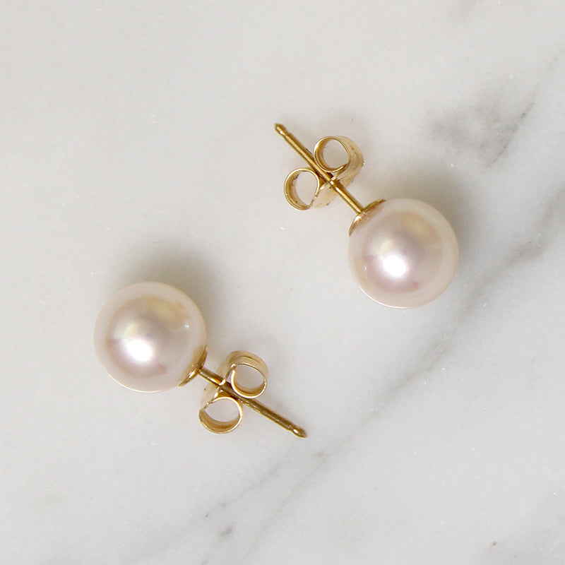 Luminous Akoya cultured pearls with a pale pink blush are set in 14k gold stud earrings. They have that luster and glow you look for in good pearls.