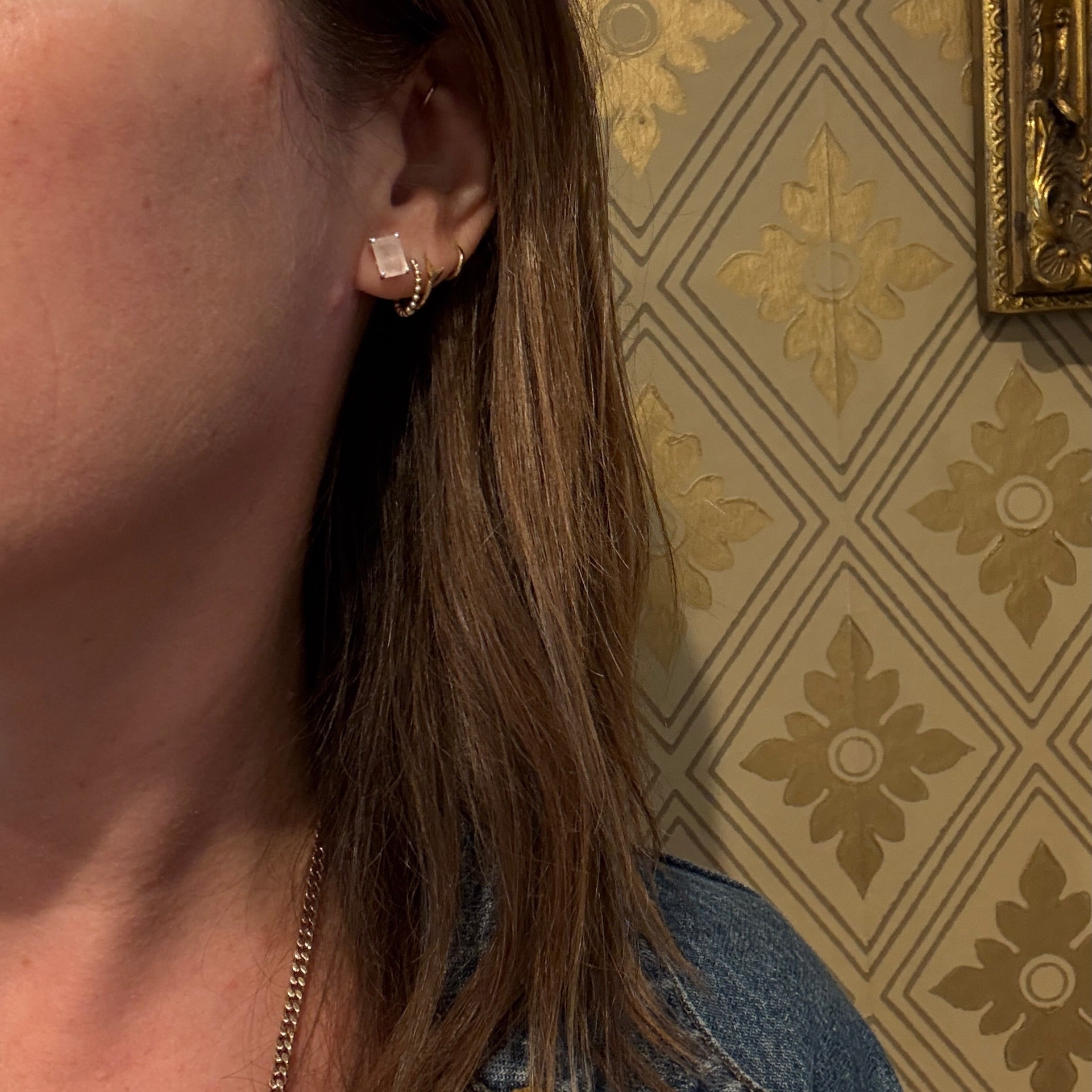 Quartz of the palest pastel pink is set in these recycled sterling silver stud earrings. Each emerald-cut gem sits in a four-prong basket setting that is pierced with a delicate lattice pattern. These artisan earrings are a classic style, perfect for daily wear.