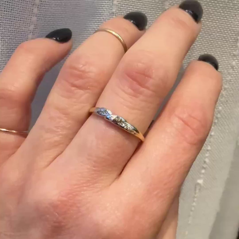 This pretty 2-tone band has three twinkling diamonds set in swoops of 14k white gold. The band of the ring is 14k yellow gold. Two-tone gold makes this lovely band so versatile it will go with everything. Circa 1940.