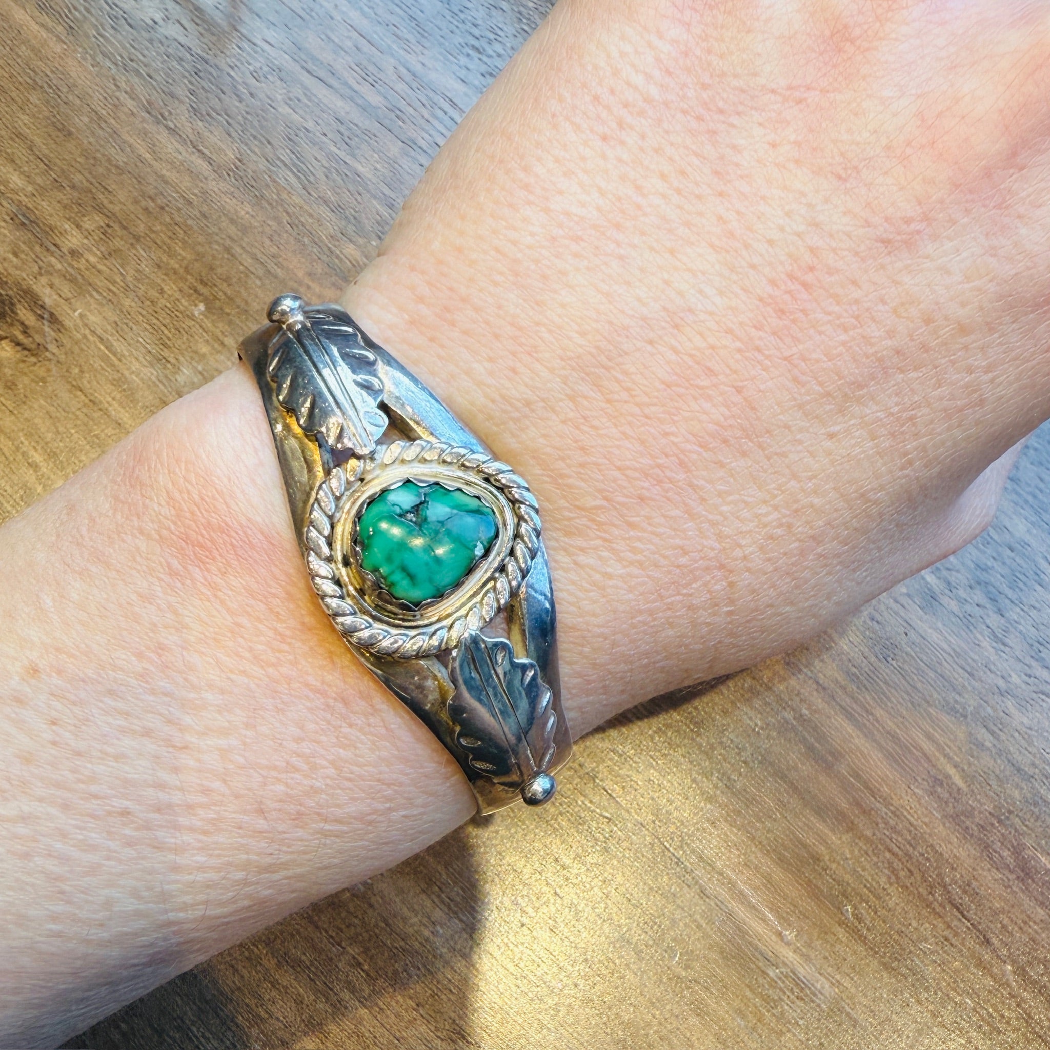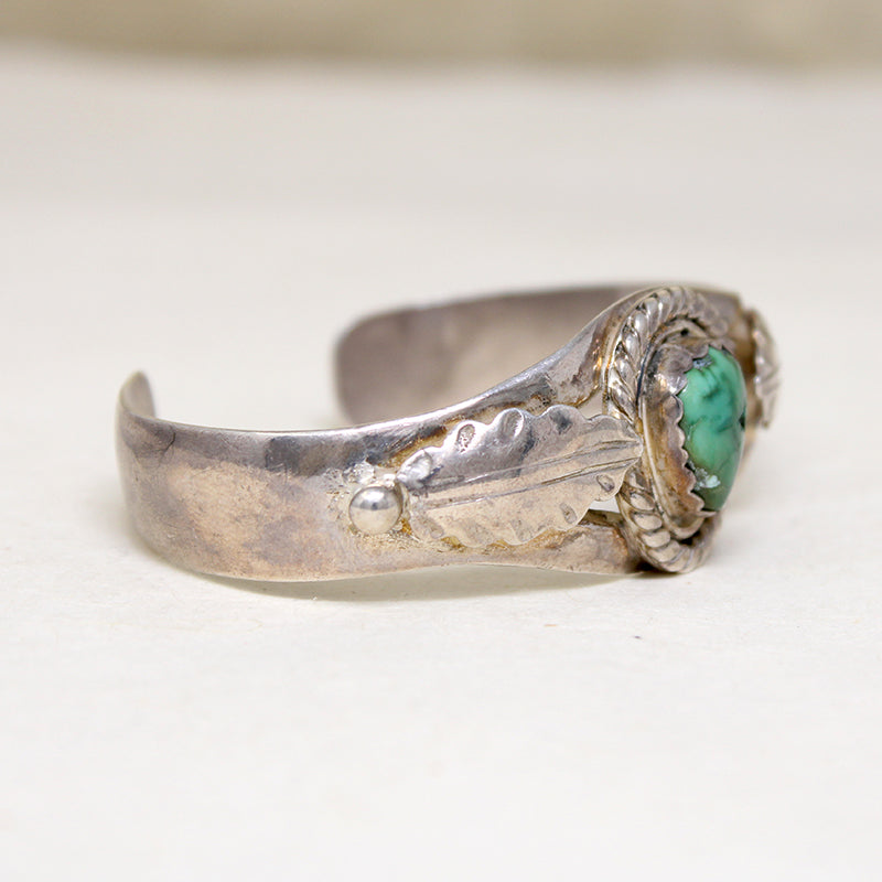 Pretty Green Turquoise Sterling Cuff with Appliqué Leaves