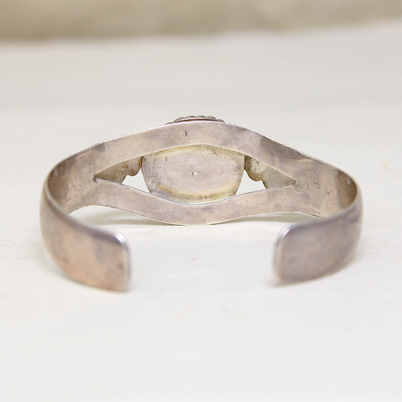 Details.....The cuff's exterior measures 2.35" by 1.95", .88" wide at the front and .45" wide at the terminals. It measures 2.24" across the interior, with a 6.25" inner circumference. In Very Good Vintage Condition. All vintage items will show some wear, it is considered part of their charm.