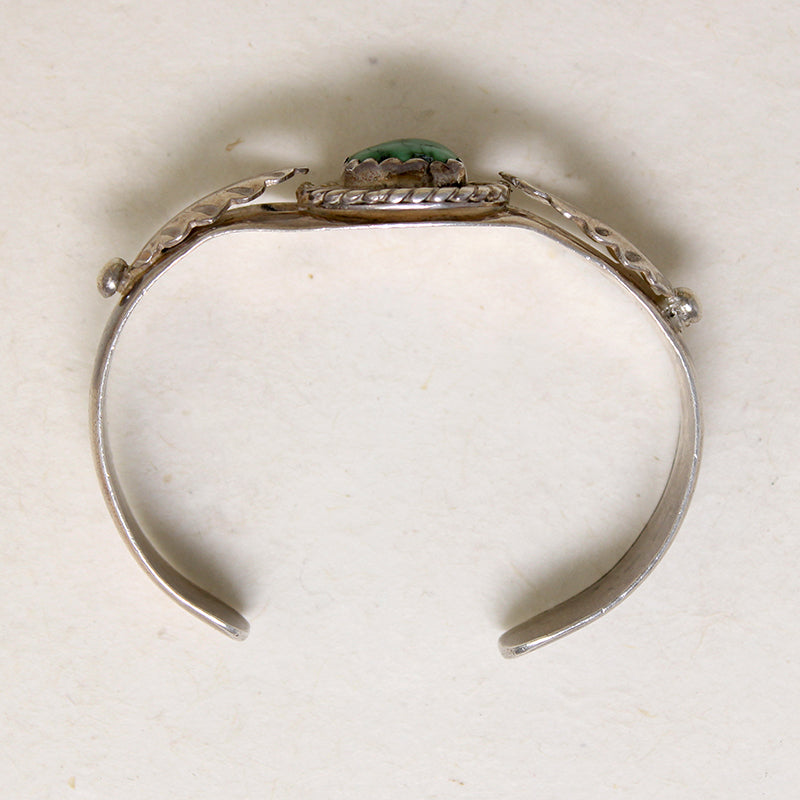 This pretty sterling silver cuff bracelet is set with gorgeous green turquoise and embellished with appliqué leaves. The cuff is a wide, flat band, split at the top. The turquoise is center-set in a hand cut bezel, framed in twisted silver wire. Applied silver leaves frame the beautiful natural turquoise. Circa 1970.