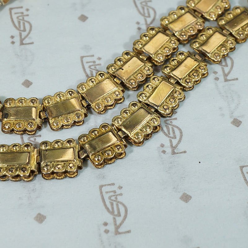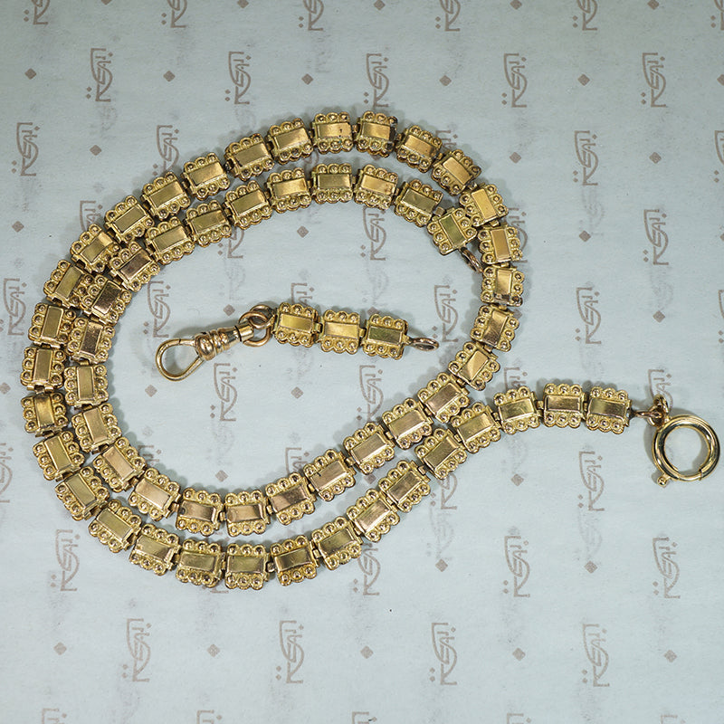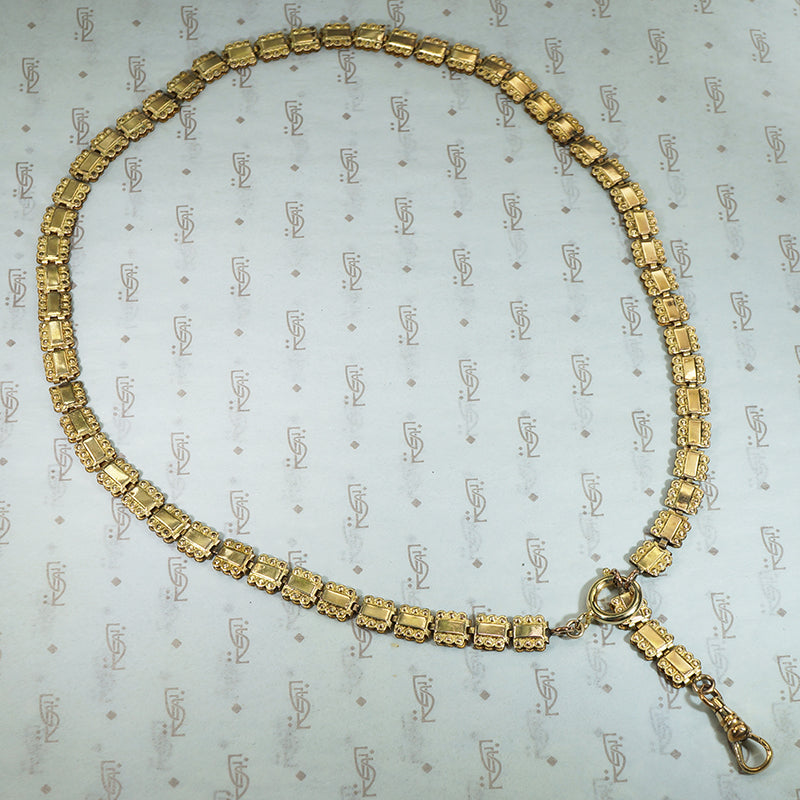There are a few theories about why these types of chains are referred to as book chains. I think its because the little folded links look like the front and back of a book, some say it is because these flat links were often used as bookmarks. Whatever the reason for the name this is a pretty awesome chain. The three link tail which holds the watch swivel hook is completely removable so you can just wear this as an attractive shiny collar necklace. I like to keep the hook on it because I am obsessed with attaching fabulous things from to it, a fob, a locket, a charm or all of them. The links are sheeted with gold. The ingredients date to circa 1880, the bolt 1940.