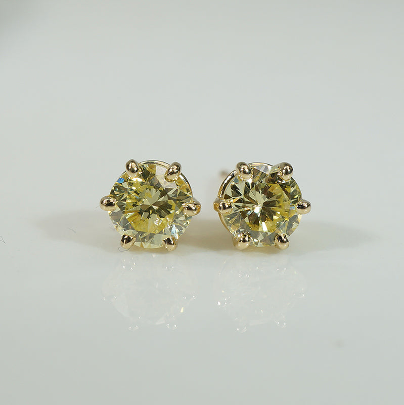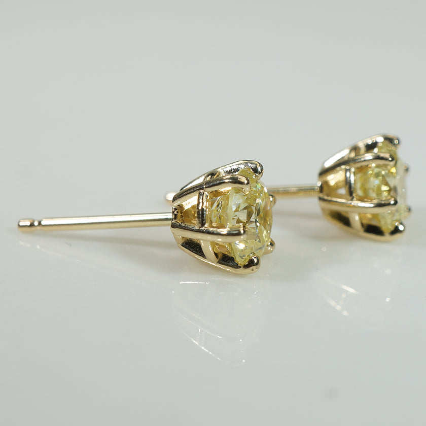These warm and sparkling yellow diamonds are set in 14k yellow gold stud earrings. These gorgeous diamonds have a total weight of 1.02 carats. The stones are held in vintage style basket settings of recycled gold. The diamonds are vintage and the settings are recycled.