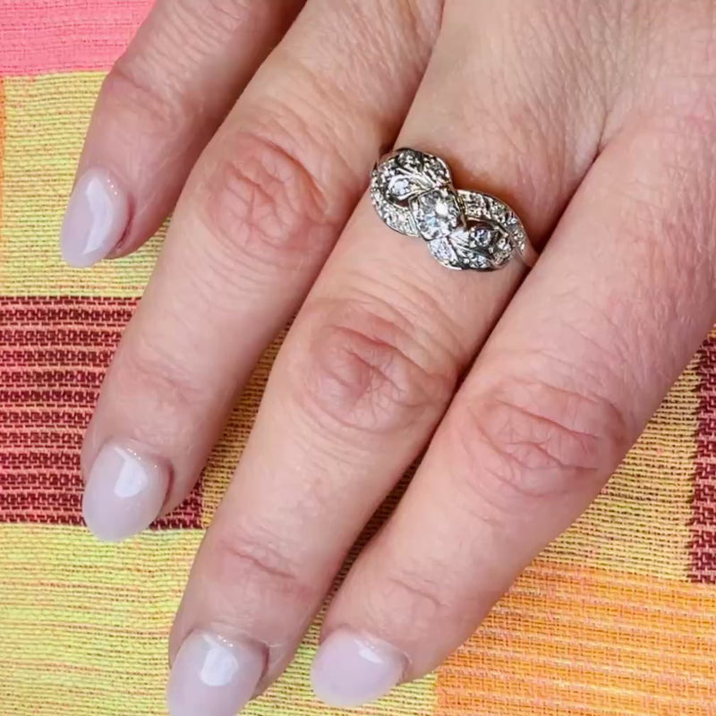 This romantic 14k white gold and diamond ring has a lovely flowing design. A diamond-set ribbon swirls over the top of the ring, curling across springs of spangled leaves. A sparkling diamond sits at the center, anchoring the ring's fluid lines. The effect is similar to a low profile bypass ring. The diamonds have an approximate .50tcw. This would make a charming untraditional engagement ring or a delightful right-hand ring. Circa 1940.