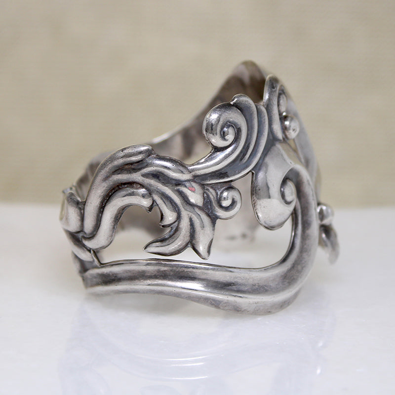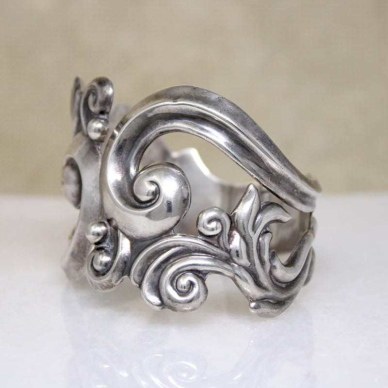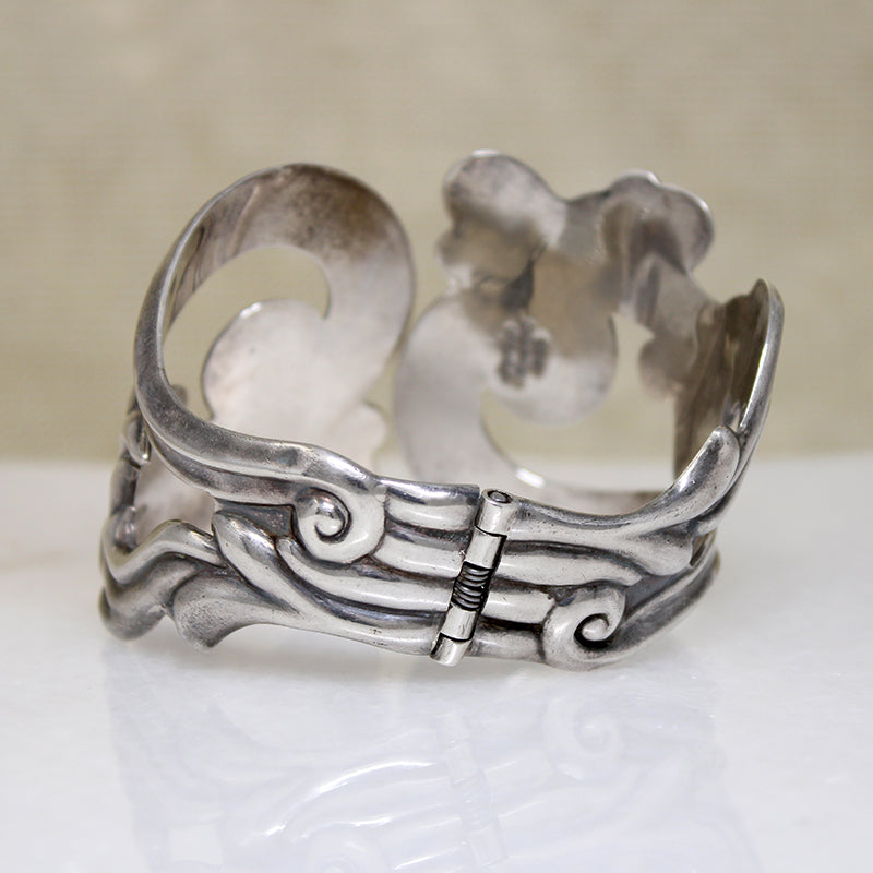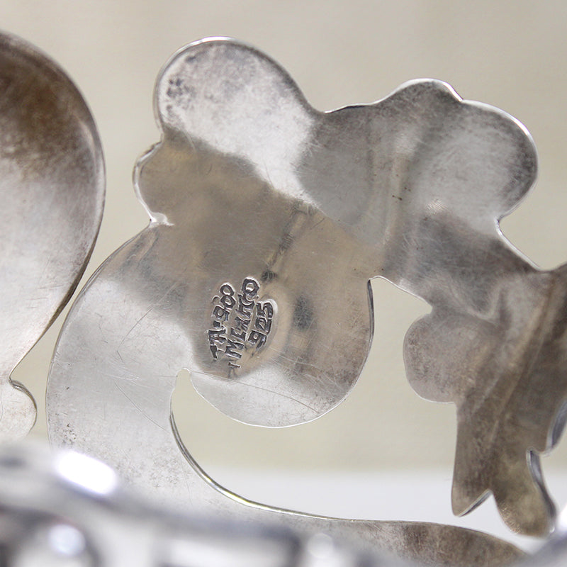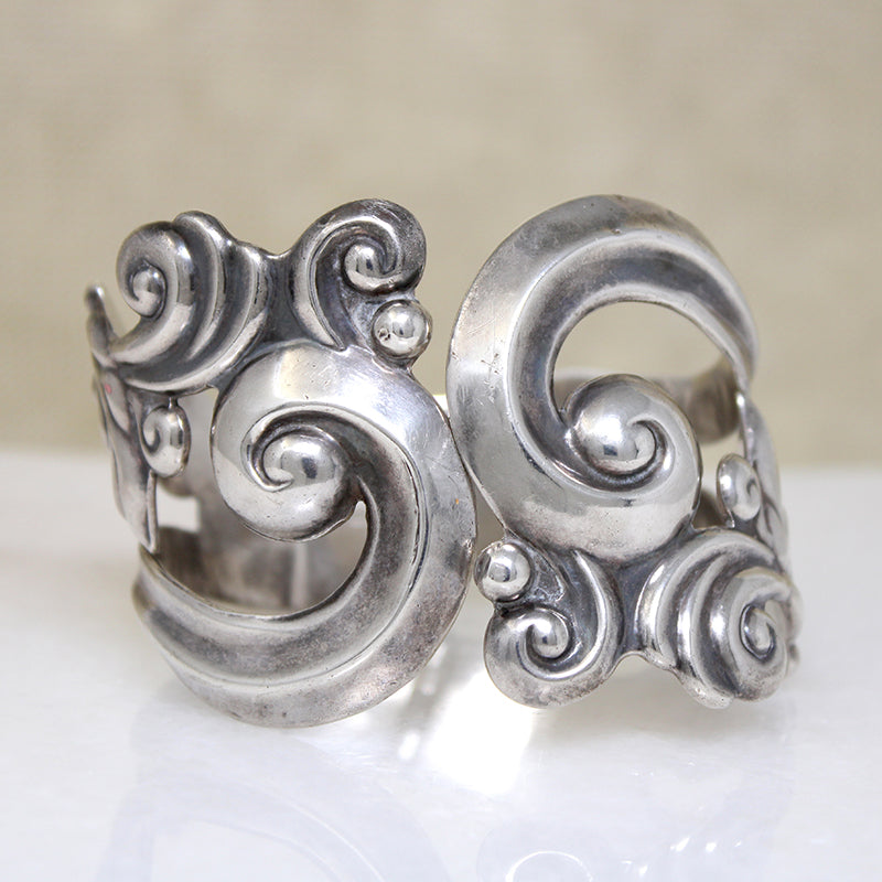This gorgeous Taxco clamper bracelet has a dramatic Mesoamerican design motif. Repoussé sterling silver work wraps the wrist in an abundance of vigorous swirls. Budding vines curl along its sides. Glossy silver beads accent the piece, like tiny bubbles dancing on the waves. The bracelet's back is hinged, allowing the piece to open and close easily. The interior is marked "Taxco Mexico 925." Circa 1960.