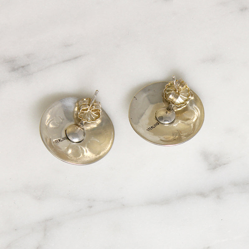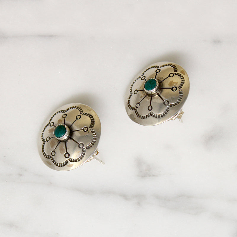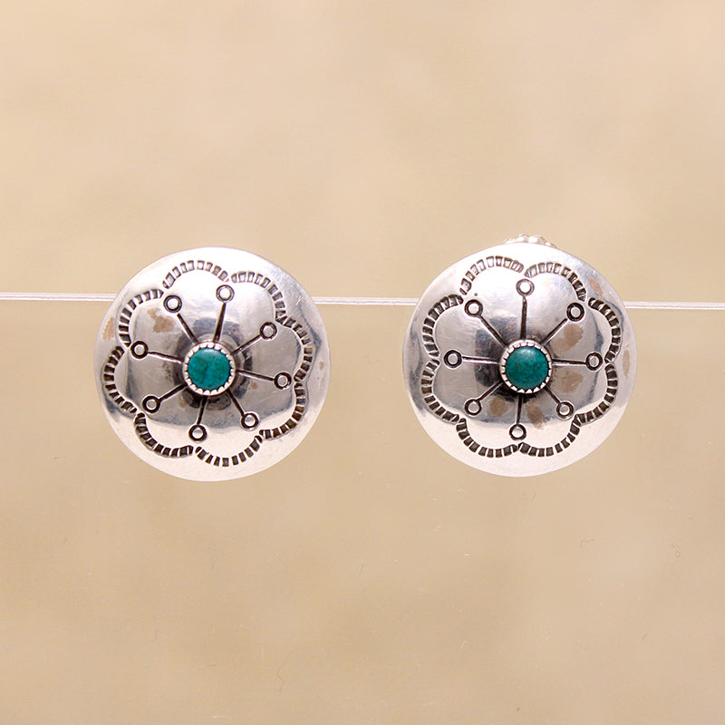 Sterling silver and turquoise stud earrings, reminiscent of Native American conchos. Round, shallow silver domes are engraved with delicate flower petals. Tiny green turquoise gems are set at the center of the conchos. These post earrings are marked "Sterling" on the back. Everything about these studs is light, bright and pretty. Circa 1950.
