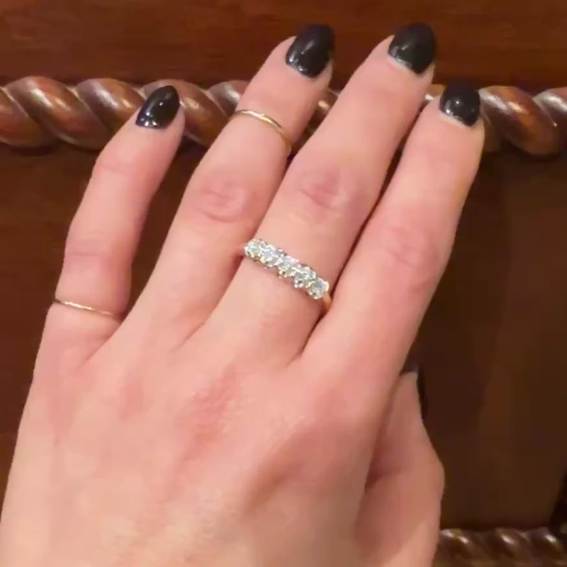 This pretty 2-tone band has five super sparkly diamonds set in the 14k white gold top. The band of the ring is 14k yellow gold. Two-tone gold makes this lovely band so versatile it will go with everything. Circa 1940.
