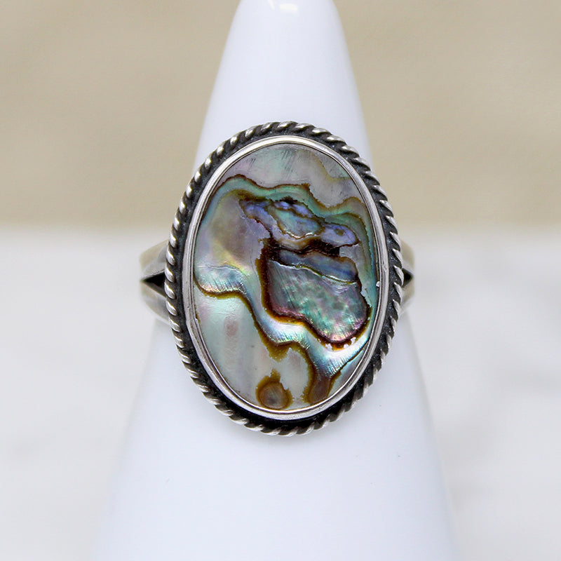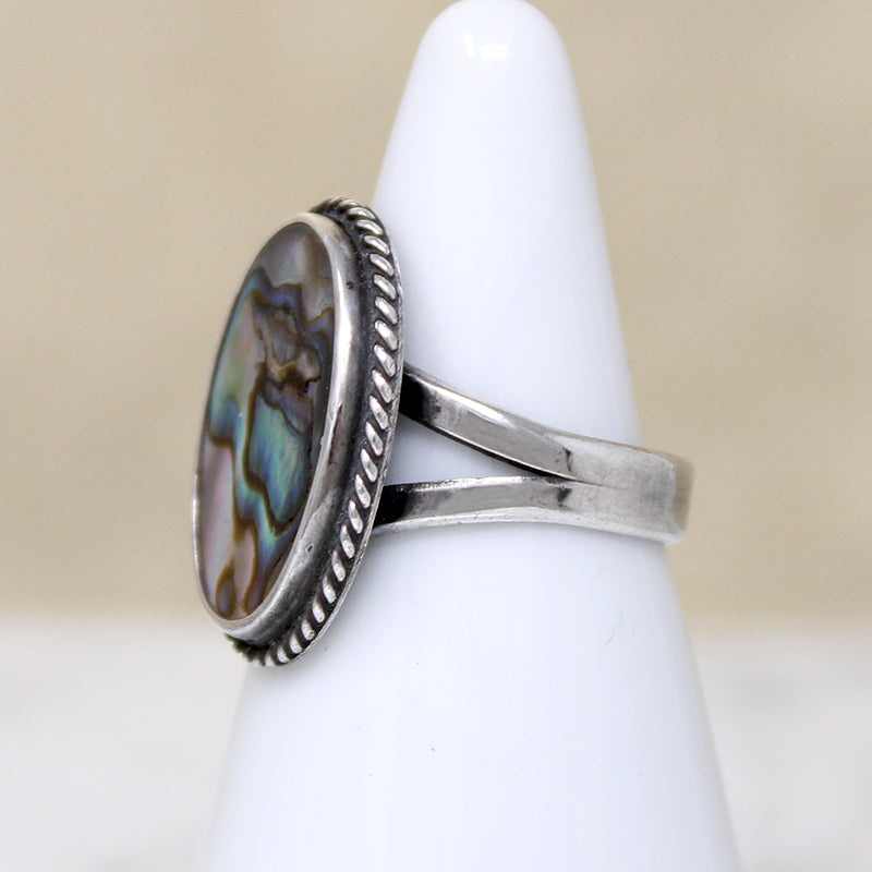 An oval slab of iridescent abalone is set in this pretty sterling silver ring. The shell is richly colored with magical swirls of green, blue, pink ... gorgeous. The abalone is bezel-set on a flat silver plaque, framed in twisted wire, and set atop a split shoulder band. Circa 1970.