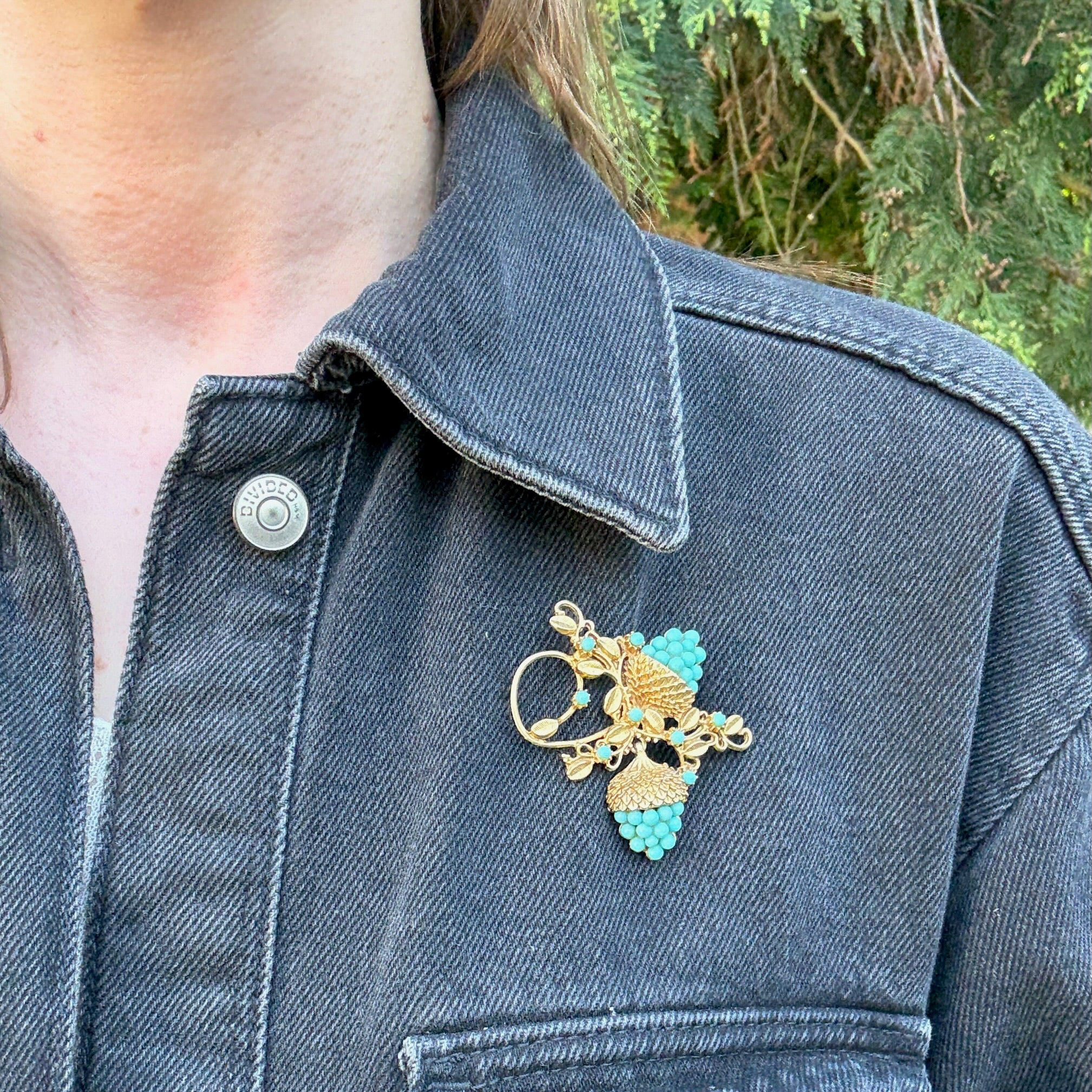 A Victorian Revival brooch with a charming acorn motif. Clusters of faux turquoise cabochons form the nuts, set beneath exquisitely sculpted gold-tone caps. Delicate tendrils and tiny leaves curl around the pair of acorns. Another unsigned work of art. Circa 1950.