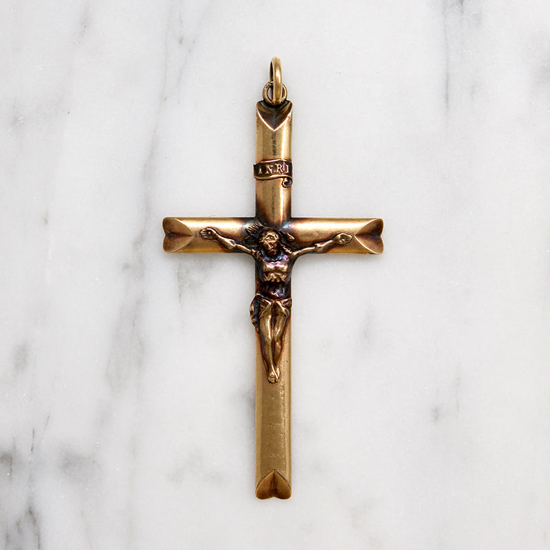A vintage crucifix, exquisitely sculpted in 18k gold. Iridescent bloom gives the figure of Christ depth and emphasizes its careful detail. A jump ring has been added to the piece's bale for ease of wear.
