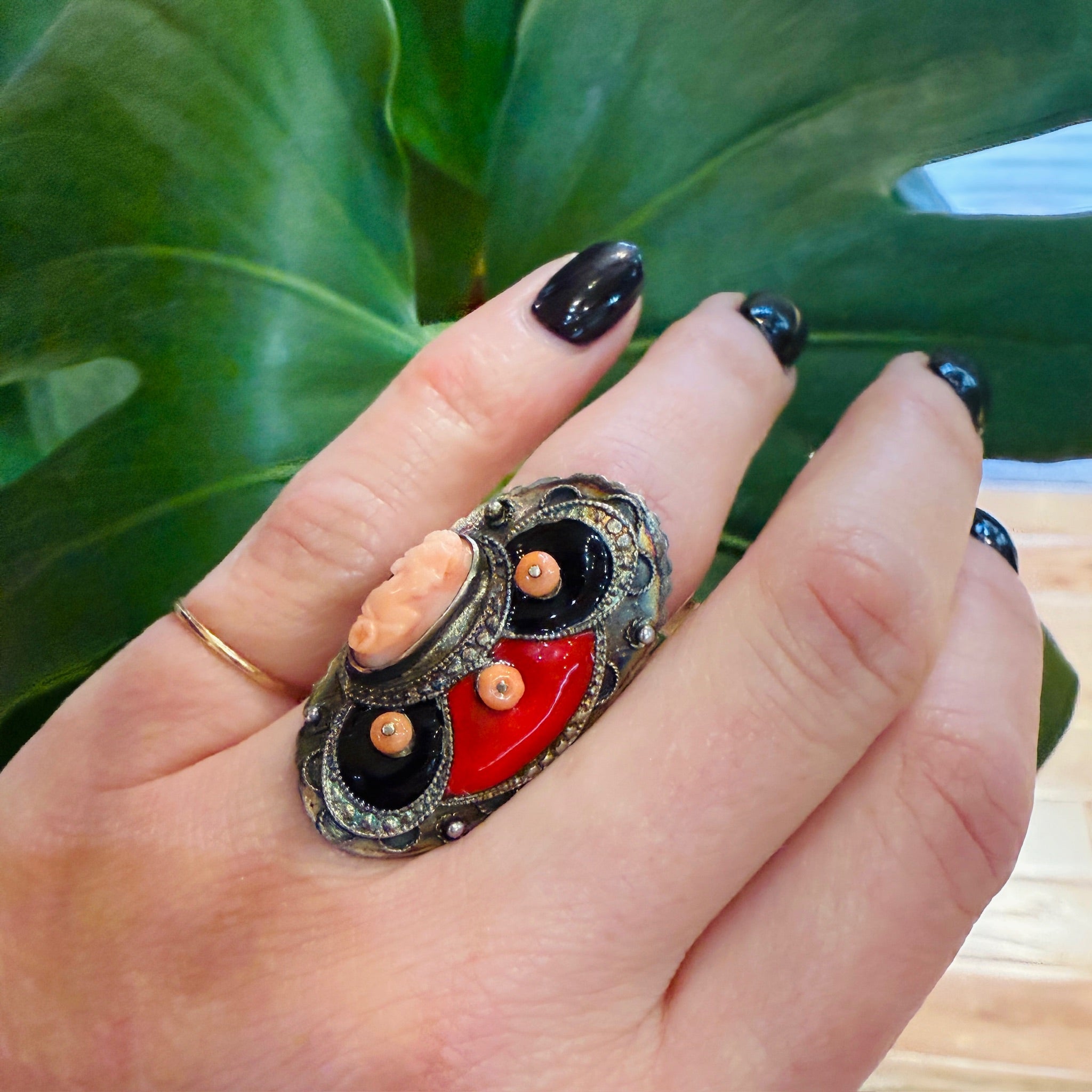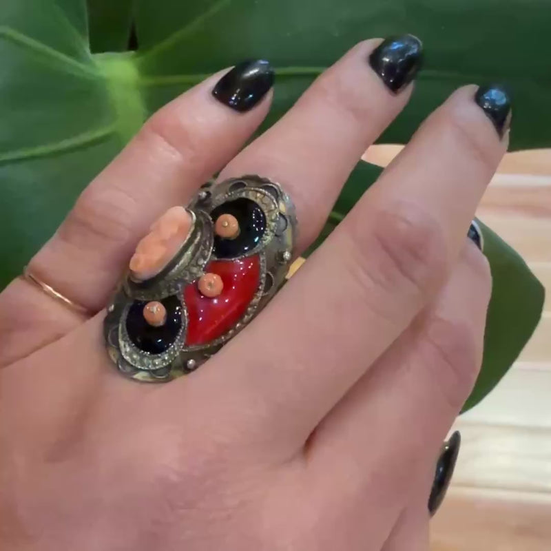 Wild Art Deco Sterling & Enamel Cameo Ring