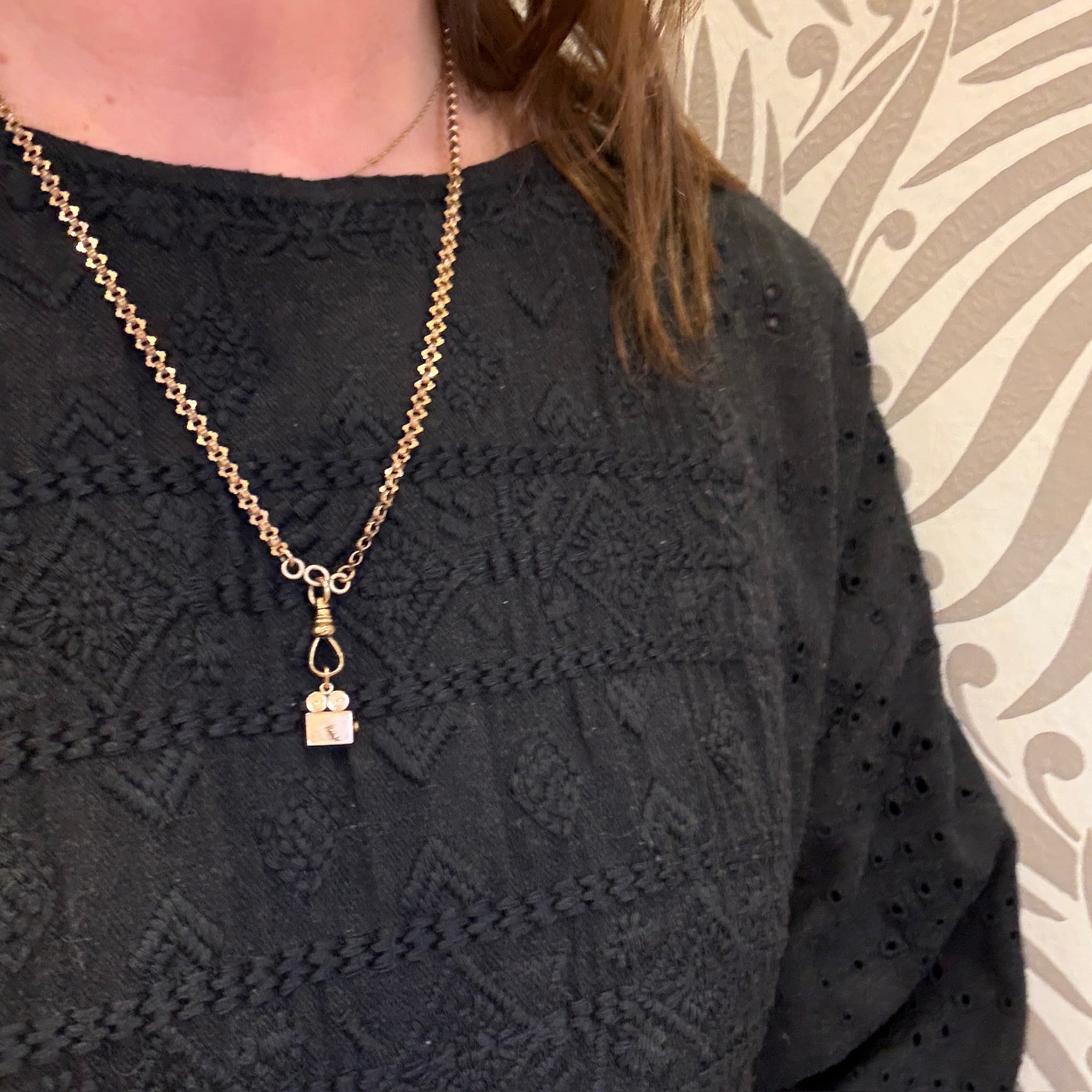 Details.....The necklace measures 20.5" long. The chain measures 4.2mm wide. The drop is .78" long. Each item from this jewelry line is unique and incorporates re-purposed vintage and antique pieces. Small imperfections are to be expected and considered part of their charm.