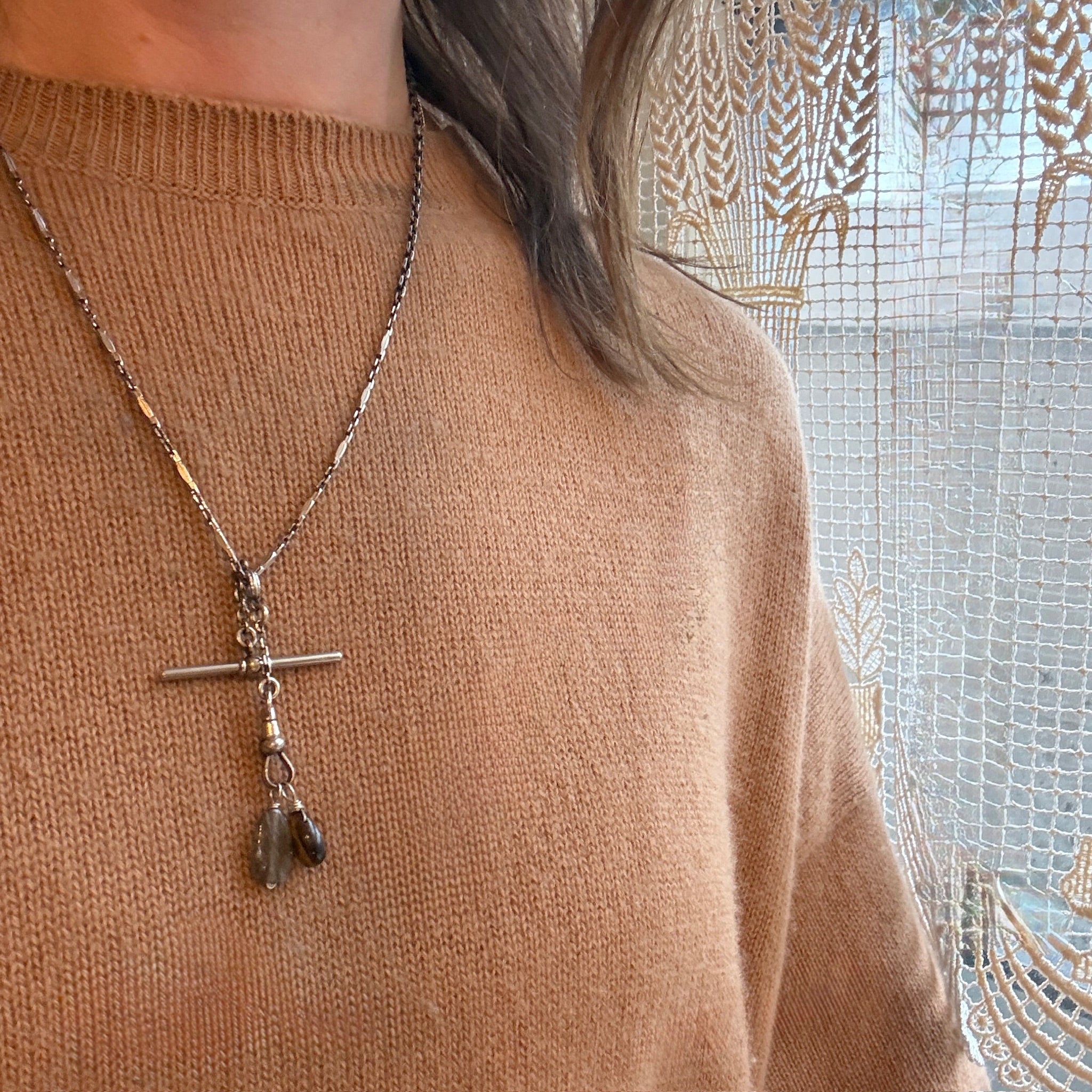 Details.....The necklace measures 19" long. The chain measure 4.5mm wide. The drop is 2" long. Each item from this jewelry line is unique and incorporates re-purposed vintage and antique pieces. Small imperfections are to be expected and considered part of their charm.