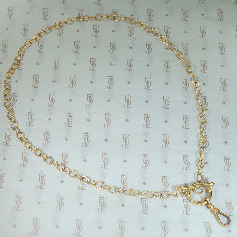 Details.....The necklace measures 18" long. The chain measures 4.5mm wide. the toggle is .58" across. Each item from this jewelry line is unique and incorporates re-purposed pieces. Small imperfections are to be expected and considered part of their charm.