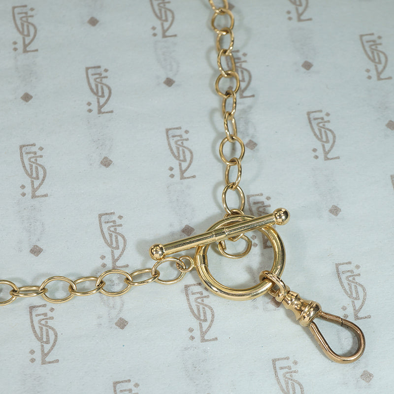 This is that pretty and practical chain you have been looking for. When you take off your engagement ring just snap it on the hook and no worries. It's also just the chain for your lockets, pendants, and favourite charms. All recycled 14k yellow gold.