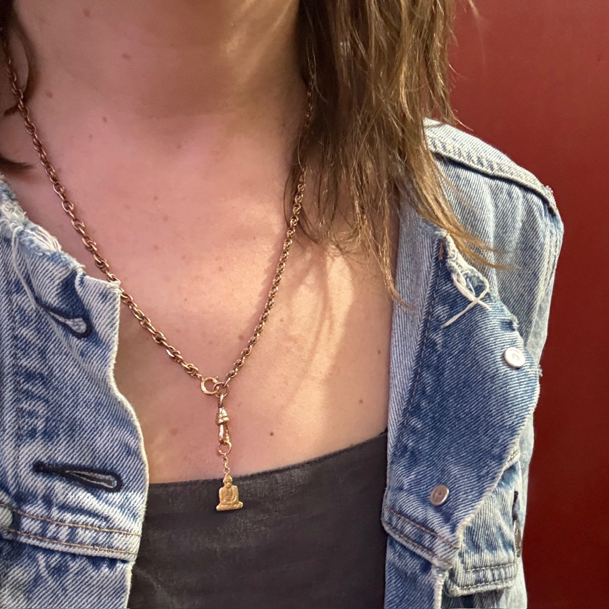 This is a gorgeous handmade 14k gold chain. Each link is comprised of two panels. The chain can be worn at its full length by attaching the hook and bolt to each other. I like to wear it with the hook dropping from the chain by attaching the bolt to the open ring. And attach something fabulous from the hook, a fob, a locket, a charm. The ingredients date to circa 1880.
