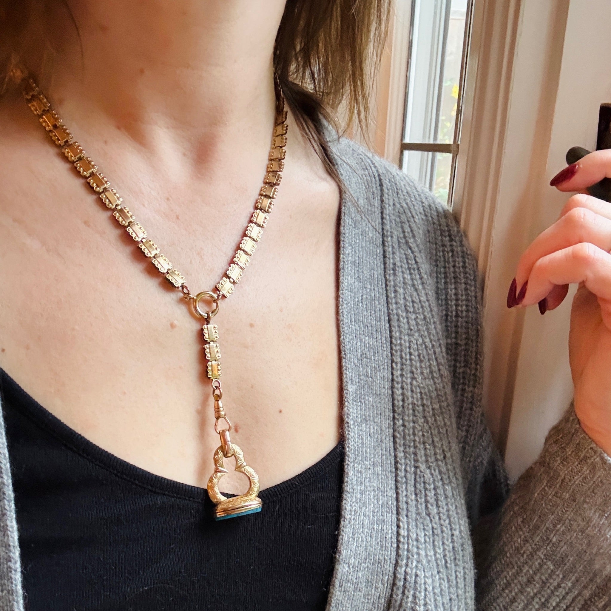 There are a few theories about why these types of chains are referred to as book chains. I think its because the little folded links look like the front and back of a book, some say it is because these flat links were often used as bookmarks. Whatever the reason for the name this is a pretty awesome chain. The three link tail which holds the watch swivel hook is completely removable so you can just wear this as an attractive shiny collar necklace. I like to keep the hook on it because I am obsessed with attaching fabulous things from to it, a fob, a locket, a charm or all of them. The links are sheeted with gold. The ingredients date to circa 1880, the bolt 1940.