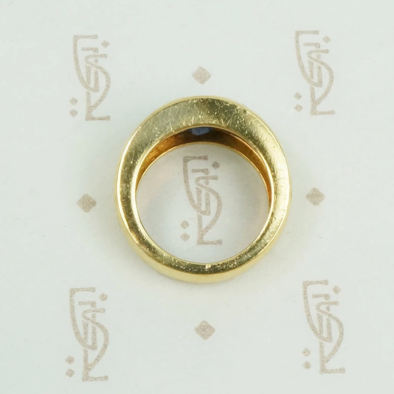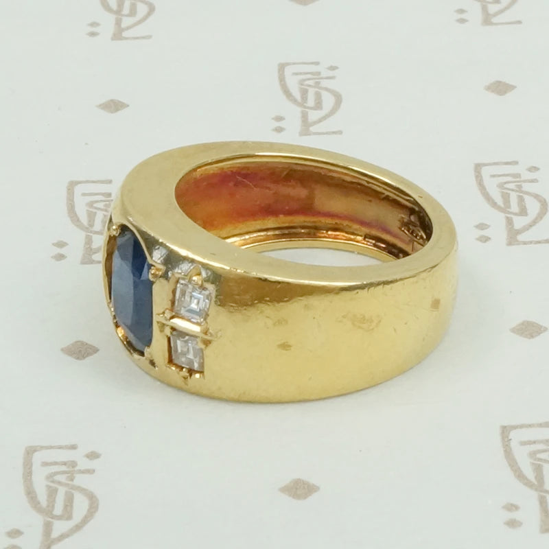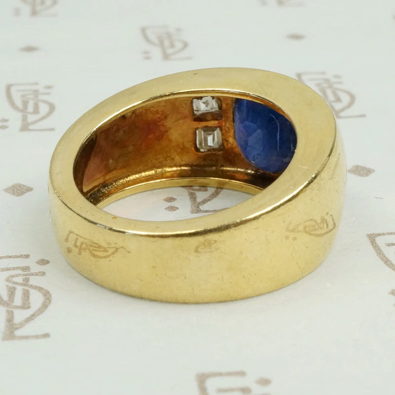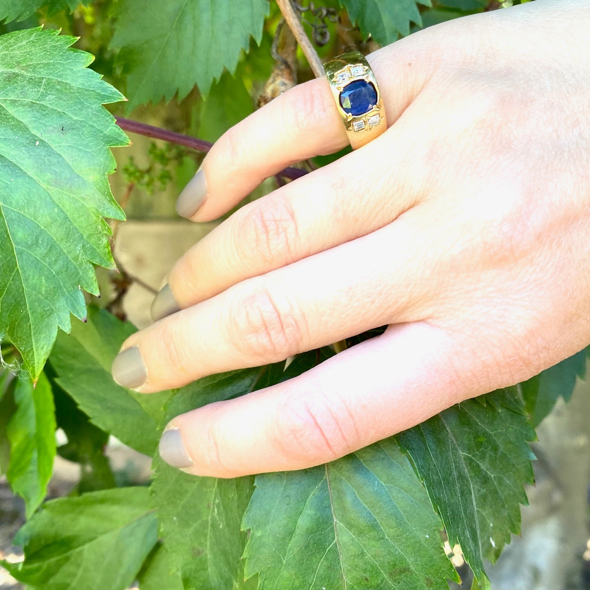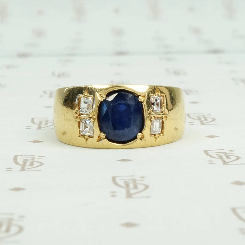 Every vintage jewelry lover needs a gypsy band, and this one is Fab. Marked in the band 750 for 18k gold the front of this band holds an oval 1.25ct blue sapphire, to either side of the sapphire are unique old diamonds. The four diamonds are squarish with open culets and lots of personality. Circa 1910-20.