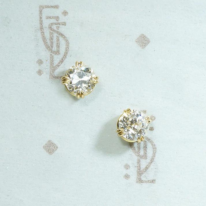 Stud earrings set with Antique Diamonds give you a unique version of that classic jewelry wardrobe staple. This pair is made of recycled 18k yellow gold set with Old European Cut Diamonds dating from the turn of the 20thc. Gorgeous and ready to be your everyday earrings.