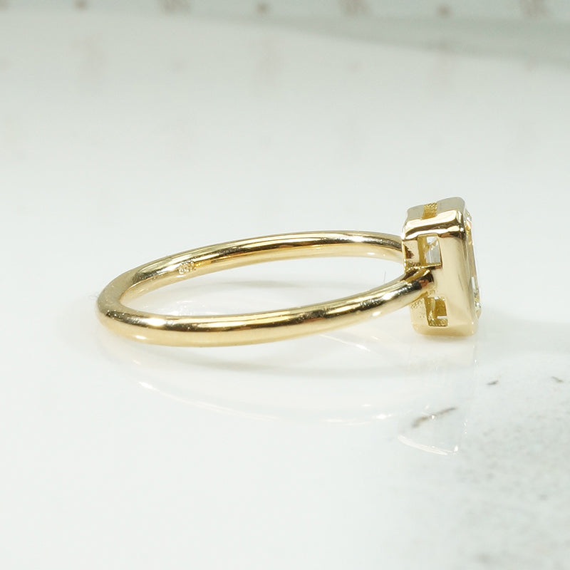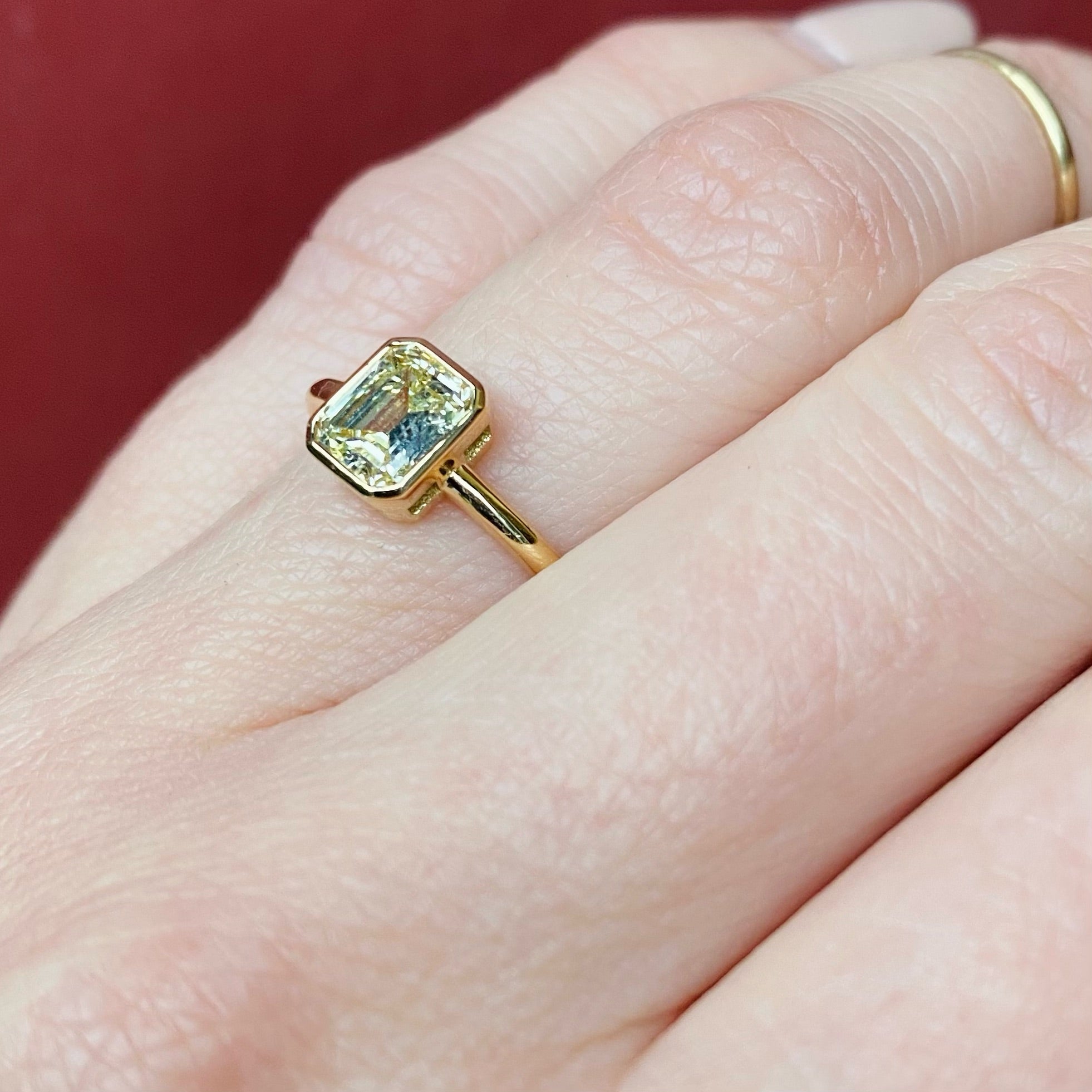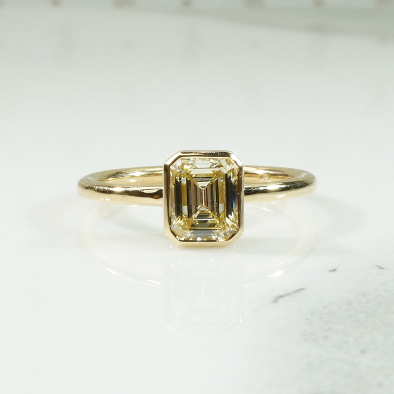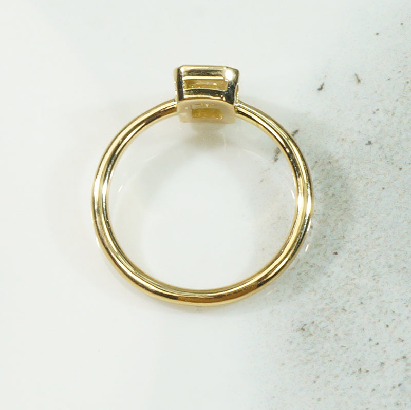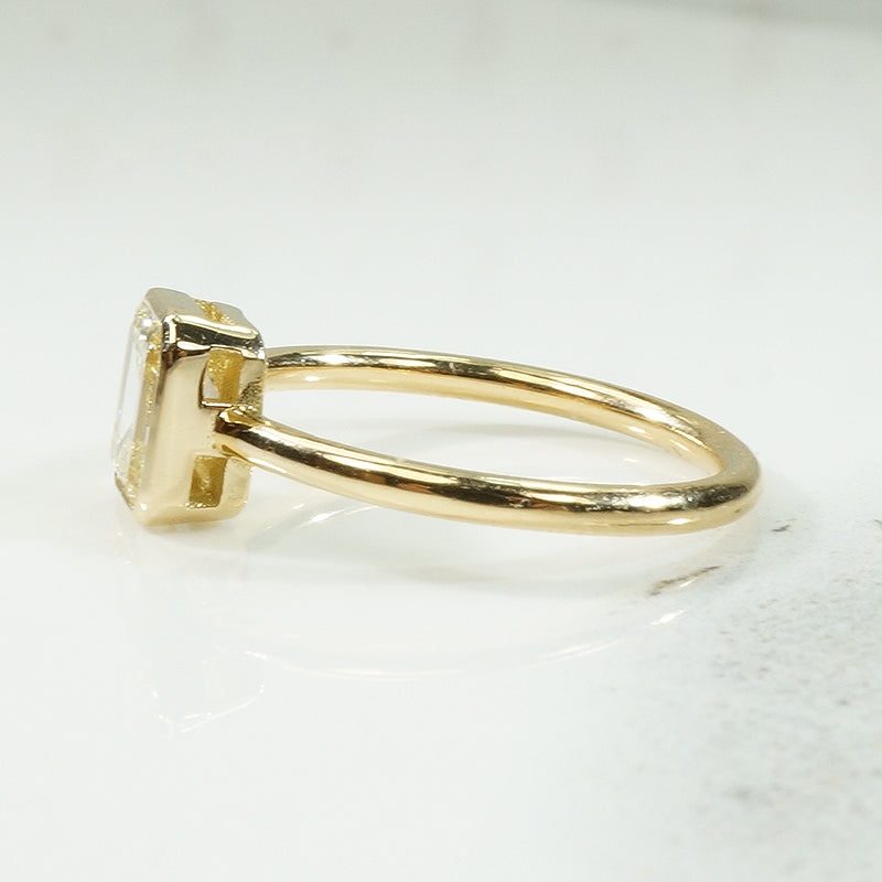 A stunning pale yellow cut corner emerald cut diamond is bezel set in rich 18k yellow gold. Balanced and beautiful, the design of this ring will always be in style. This ring is lovely, strong, and comfortable to wear. The natural Diamond is a .76ct Emerald step cut VS clarity and Pale Yellow, the gold is recycled 18k.